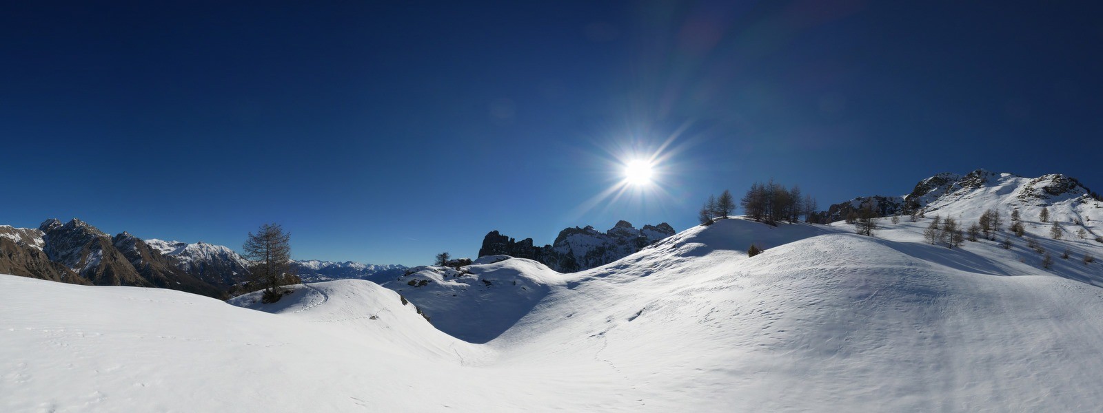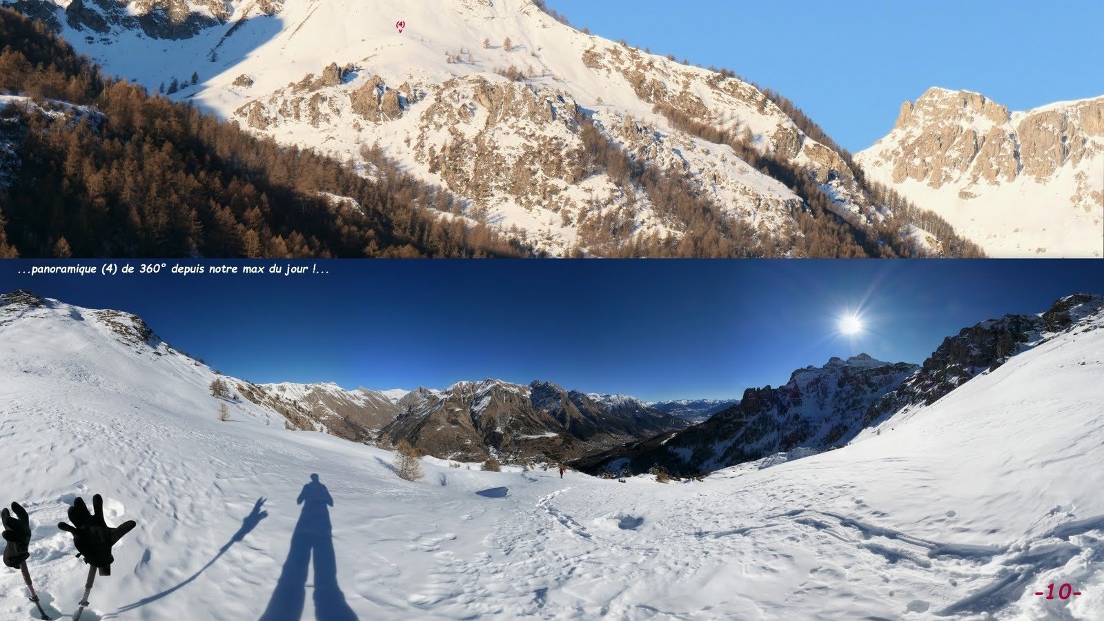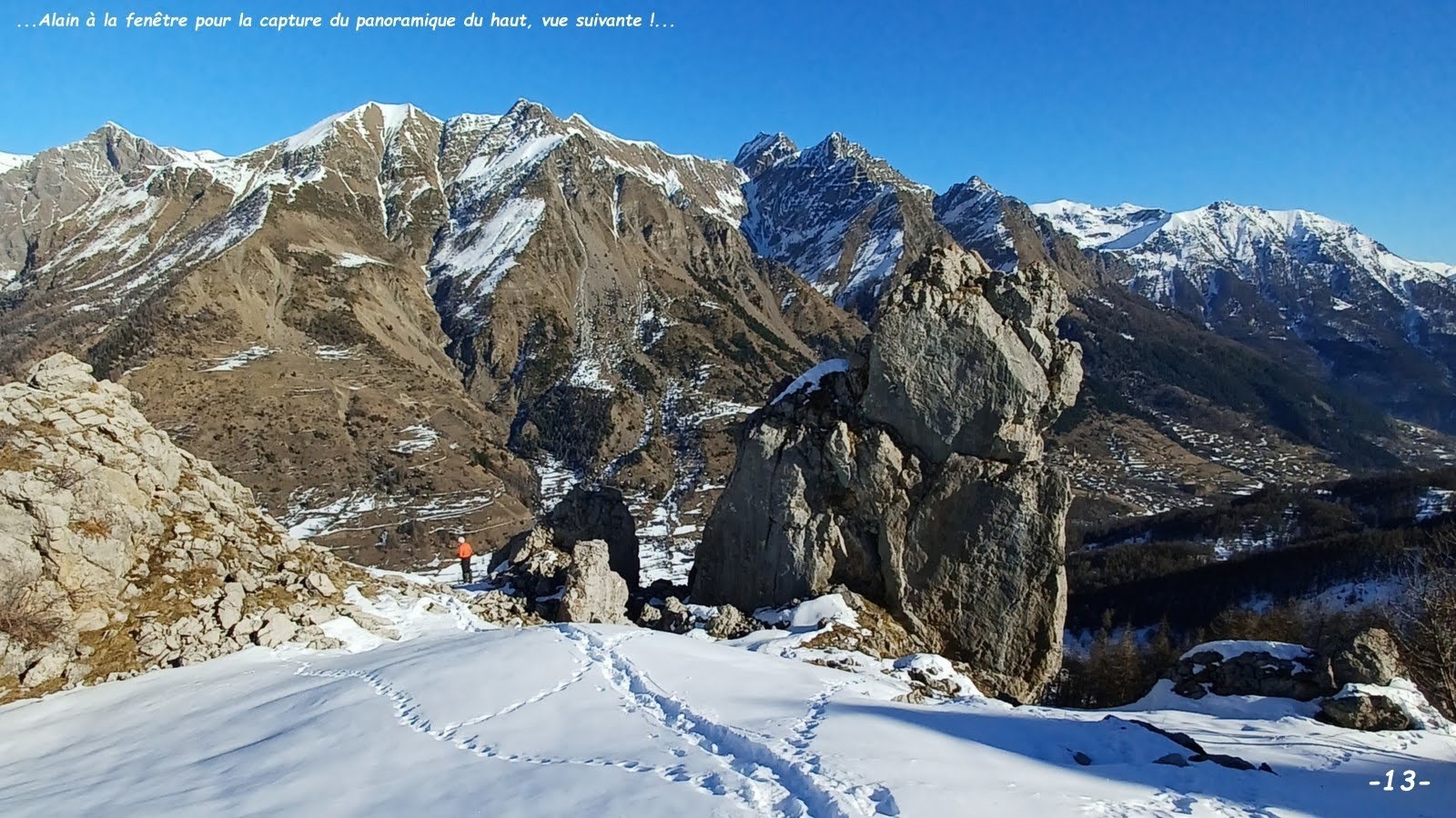 Eh bien ! il m'aura fallu attendre ma septième dizaine pour enfin visiter ce site ignoré des géographes puisque même pas nommé sur la Top 25 de l'IGN ! et pourtant repéré de longue date par l'Ours depuis la crête qui le domine; il faisait partie de sa longue liste de pépites réservées à leur retraite, raison pour laquelle il y était déjà venu en randonnée à skis de Télémark avec la Marmotte dès leur première année embrunaise et depuis souhaitait y revenir en raquettes, persuadé que ce serait encore mieux pour en effectuer une visite plus exhaustive. C'est dire si j'en avais entendu parler, maintes fois rappelée à sa vue depuis tous les sommets environnants ! serait-ce parce que le dénivelé cumulé mis en oeuvre est largement inférieur aux fatidiques 1000m exigés pour qu'une randonnée le satisfasse pleinement qu'il m'a fait attendre jusqu'ici pour que je puisse à mon tour profiter de ce petit bijou en l'espèce ? il a beau prétendre que pas du tout et que c'est purement lié aux conditions assez rares de l'enneigement de ce mois de janvier ! j'ai encore un petit doute et pencherais plus simplement pour le fait que l'avoir eu sous les yeux pendant près de 4 longues heures