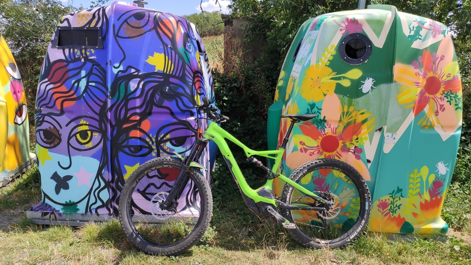 Grimpette de 460 à 630, Et nourriture de l'esprit: Festival Land'Art de Rontalon , édition 2023 , I believe I can Fly de Gleb Dusavitskiy, c'est l'oeuvre qui retient mon attention, les autres moyen/moyen .... En tout cas ça ne me remplit pas l'estomac , les courgettes qu'on m'a proposées au bord du chemin un peu plus bas ( voir photo) étaient crues ! 1 banane 2 barres et c'est (re)parti .... je revois à la baisse mon topo, la météo est annoncée changeante dans l'après-midi, les nuages gris-sombre apparaissent .... Et je commence à en avoir marre des ces ronciers envahissants, parfois au niveau de la tête, à travers les manches longues du maillot, je prends qd même une belle trace pour rentrer ....avec le sentier botanique en final avant la descente dans les vergers .... Un beau tour qui normalement fait un pétale jusque vers Chaussan .... ça sera une autre fois ... ou pas