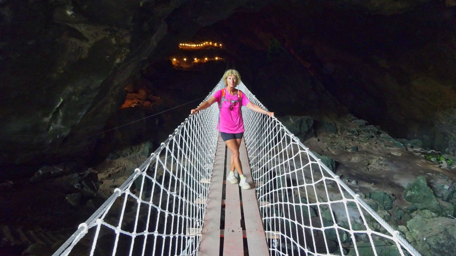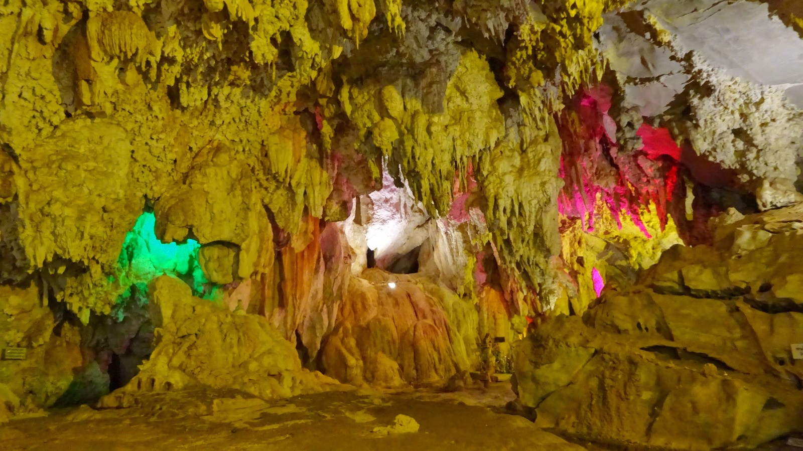 Deuxième arrêt à Tham Nang Aen, une autre grotte avec un éclairage coloré bien flashy qui malheureusement dénature la roche, le reste de la visite se fait en barque sur la rivière souterraine, elle permet d'accéder à d'autres curiosités via divers escaliers, passerelle, bref un bon moment (environ 2h00).