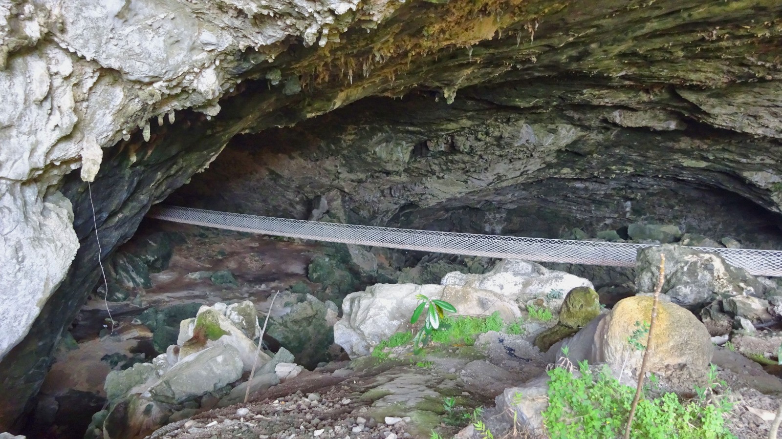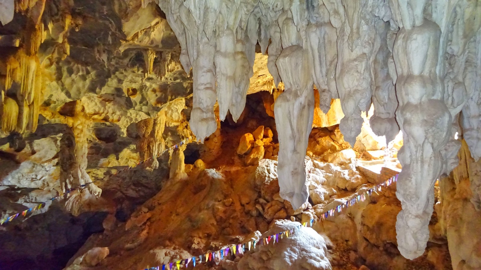 Premier arrêt à Tham Pha Nya In, une petite grotte avec une kyrielle de fanions, un autel garni de statues de bouddha et une vue sympa sur la rivière souterraine.