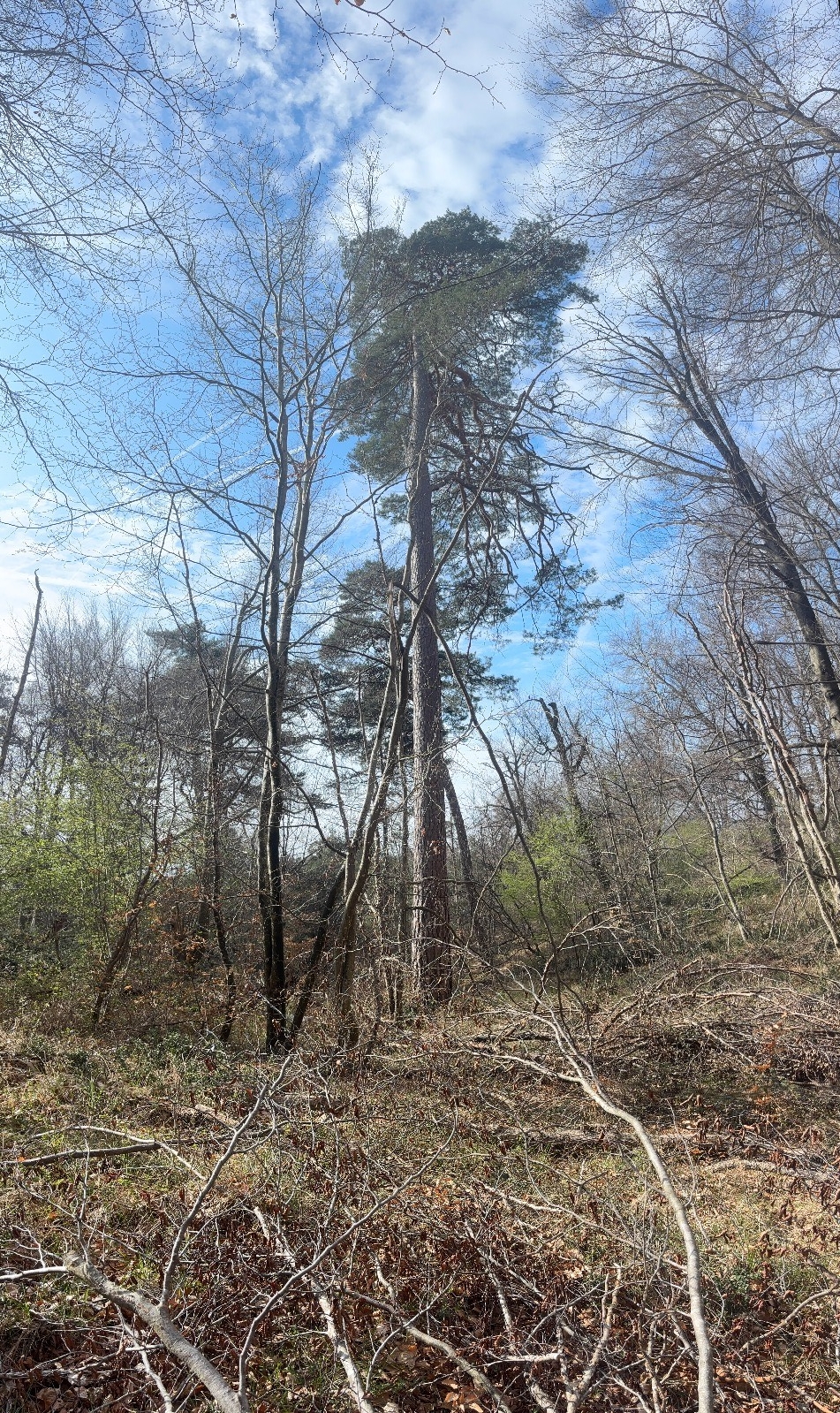Prendre à droite la route forestière de la plaine de Macherin. tourner à droite quitter le sentier bleu point après le carrefour, à gauche, se dresse un pin sylvestre à shingle (J). prendre à droite la route forestière du Faucon. au carrefour des Hêtres, rentrer dans la parcelle 739 sur une centaine de mètres, vers le sud sud-ouest en vue des Larico, en bordure de crête parmi un groupe important de Laricio sur M et N. reprendre ensuite la route forestière de faucon jusqu'au carrefour du chêne des marais.