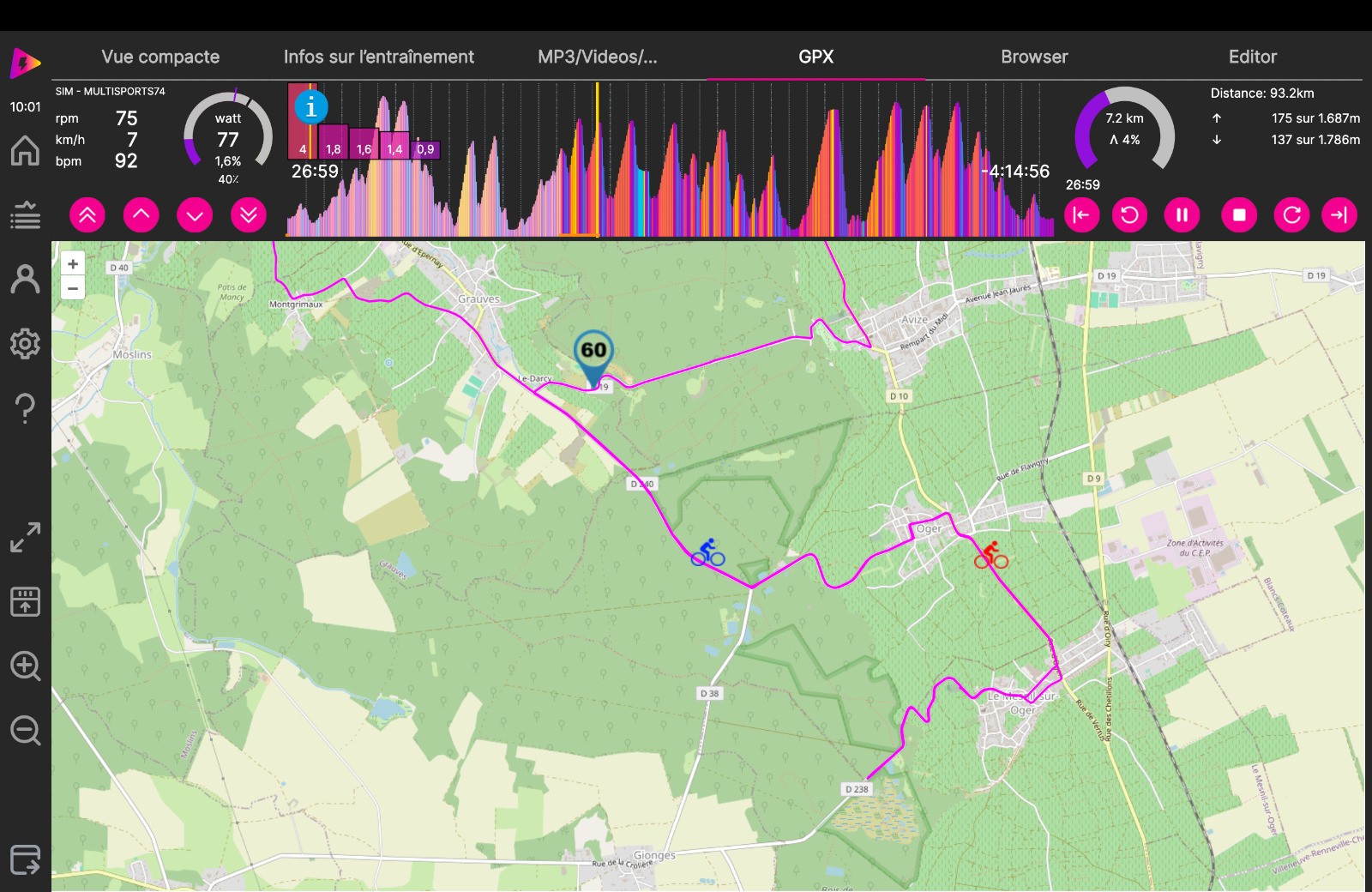 Séance d'HT : départ à partir de CRAMANT sur section d'un parcours réel dans la cote des BLANCS avec une boucle sur le MESNIL-sur-OGER et fin du parcours à MONTHELON. Les réglages n'ont pas été au top. La séance est bien inférieure à celle du réel puisque je perds 12'.