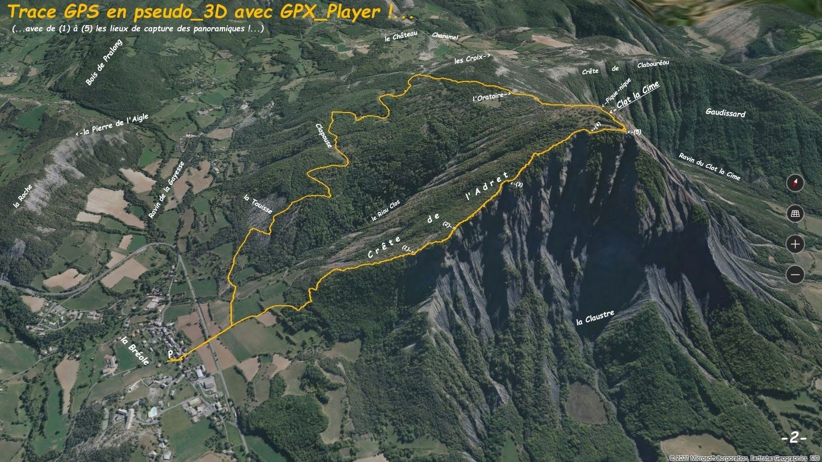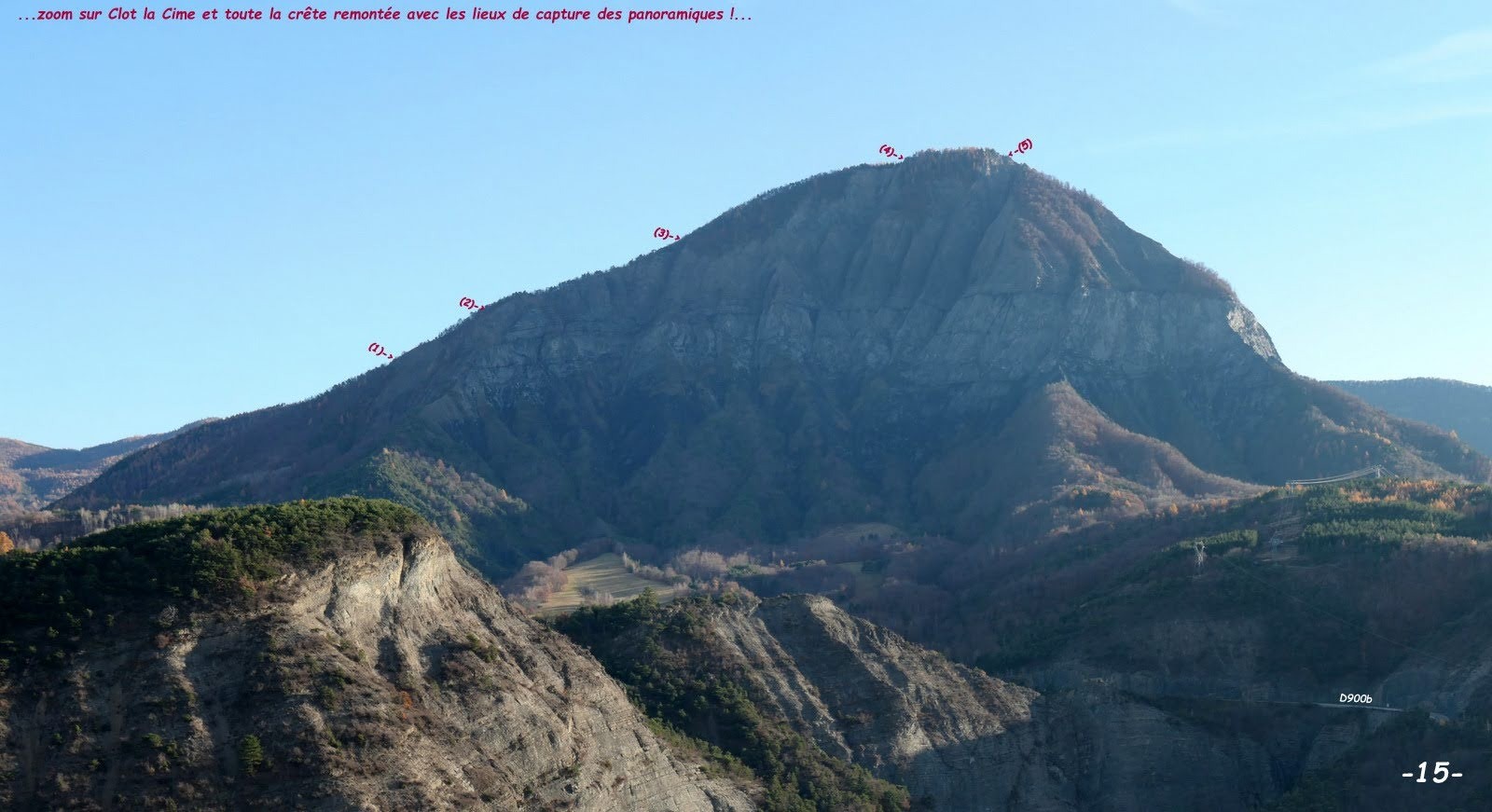 depuis le petit parking, 920m, à droite au début de la D57, en aval du mur de soutènement de la Place de la Fontaine à la Bréole > suivre le sentier balisé de Clot la Cime qui monte tout droit et traverse perpendiculairement la D900b, jusqu'à son virage à gauche à la cote 953m > continuer tout droit hors balisage sur la piste agricole d'accès aux champs en amont jusqu'à son terminus, poursuivre hors sentier (MERCI de bien vouloir respecter scrupuleusement le travail et les clôtures des agriculteurs en progressant en bordure des champs) pour rejoindre la lisière Sud-Est d'un beau bosquet de trembles > la remonter, franchir une clôture et poursuivre tout droit dans la hêtraie jusqu'à un sentier bien marqué qui monte en pente douce vers le Sud-Est > le suivre jusqu'à son franchissement de la croupe de la Crête de l'Adret, le principal intérêt de cette randonnée étant de reconnaître le parcours intégral de cette crête au plus près, pour ne rien rater du spectacle offert par les vertigineux ravins de tout l'Ubac de ce sommet qu'est Clot la Cime ! à partir de là, il suffit de remonter la crête sans réelle difficulté en utilisant au mieux les vagues sentes de chasseurs et de nombreux animaux, tout en restant bien sûr extrêmement prudent : hautes falaises assez friables pouvant s'avérer dangereuses, en bordure desquelles on ne trouve une clôture qu'en arrivant à proximité de l'alpage sommital de Clot la Cime, dont le sentier balisé n'effectue seulement qu'une toute petite partie sans même passer par le sommet géographique, un comble que nous nous sommes empressés de corriger en l'élargissant pour un pique-nique royal sur le véritable adret de ce sommet d'allure collinaire vu du Sud > retour parking par le sentier balisé de l'Oratoire, Clapouse et la Touisse, voie classique de montée.