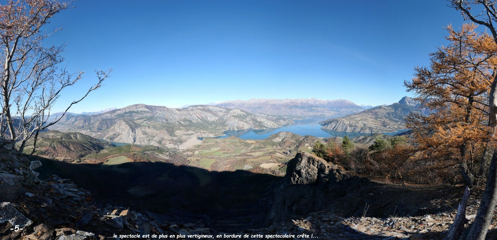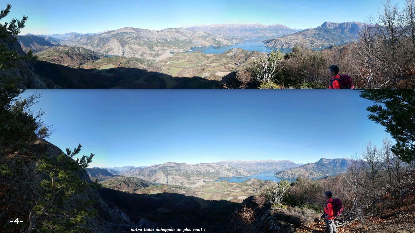 Mis à part quelques épineux au départ entre les champs et la splendide hêtraie, éternel problème des lisières presque plus entretenues, nous avons eu l'agréable surprise de pouvoir progresser à notre rythme, sans grande difficulté, la hêtraie à l'ubac étant propre et le pseudo adret n'étant plus épineux ni très dense dans cet entre-deux au gré de vagues sentes de chasseurs et ou plus sûrement de nombreux animaux en profitant d'un panorama assez époustouflant sur la Moyenne Vallée de la Durance et le Lac de Serre-Ponçon ainsi que le Barrage, voir ci-dessous les panoramiques de l'Ours.