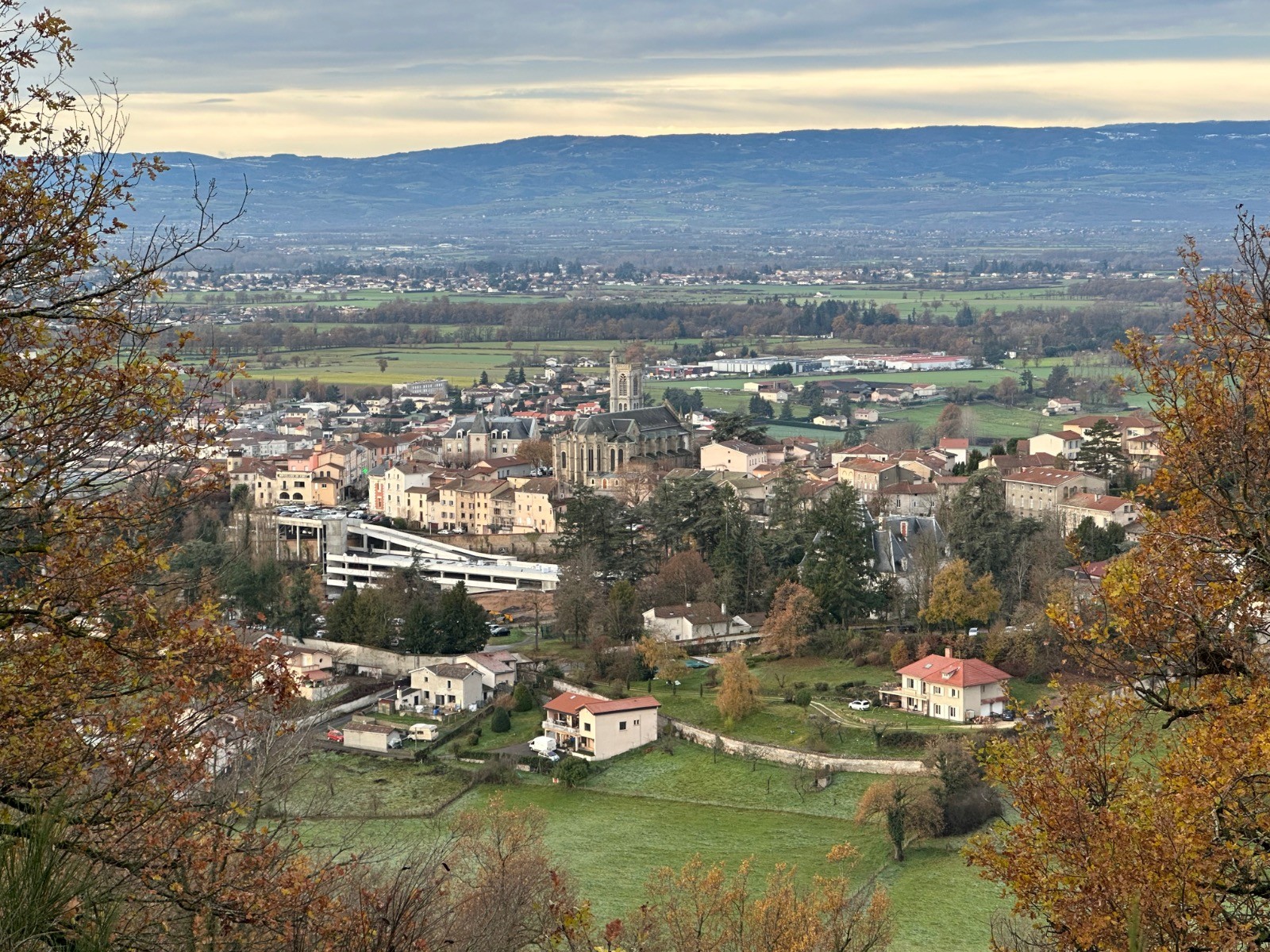 Belle montée pour arrivée aux trois croix avec une belle vue sur Saint-Galmier et les montagnes du soir