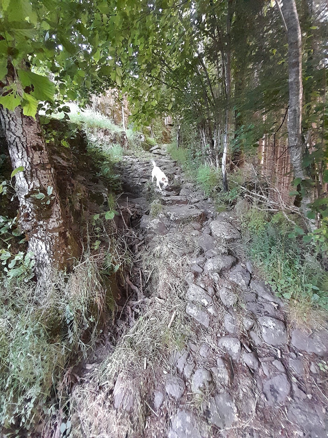 Bonjour, départ devant l'église, Mlle voulait faire le plein avant de monter ^_^ . Au Felgeadou, notre gîte pour la semaine, au bord sur sentier. Ensuite les choses sérieuses commencent. Un chemin, ou lit de torrent d'hiver pour prendre de la hauteur. Des panorama, pendant que la chienne batifole dans la végétation. Quelques belles fleurs au passage et les crêtes. Je redécouvre avec plaisir, quelle vue. Un peu plus loin, une ruine à côté du Bélédat du Cassaire, qui servait à abriter les bêtes malades. Magnifique. Ensuite un crochet non prévu vers le Refuge de Cabrespine. Quelque ruines sur la descente, qui attire toujours la curieuse. Un papillon Apollon et retour dans l?église.