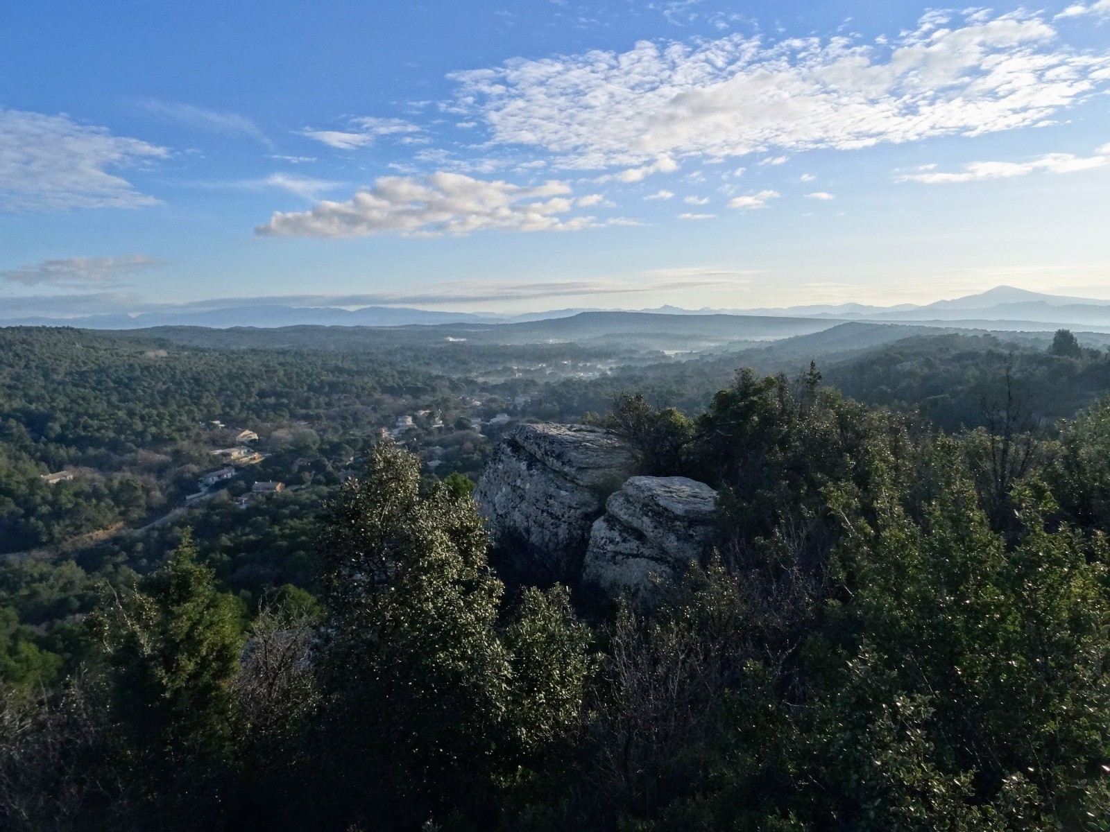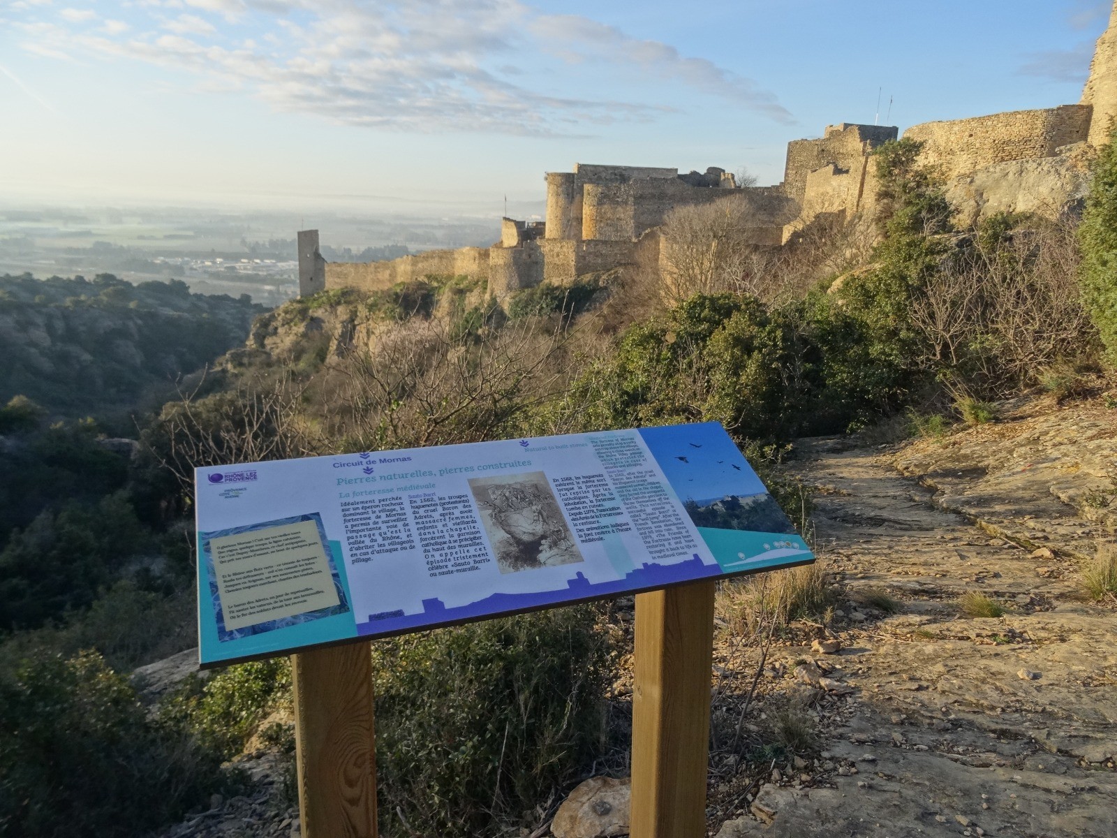 Randonnée de 22 km 650 D+ en boucle au départ de Mornas (84). Point de départ centre Parking Mornas 44.201690 N - 4.729344 E. Passage à la forteresse de Mornas Cheminement dans la garrigue direction le Castellas Ruiné et la Chapelle d'Uchaux, retour Mornas. Magnifiques vues à 360° au cours de la rando. Eviter les périodse de fort Mistral