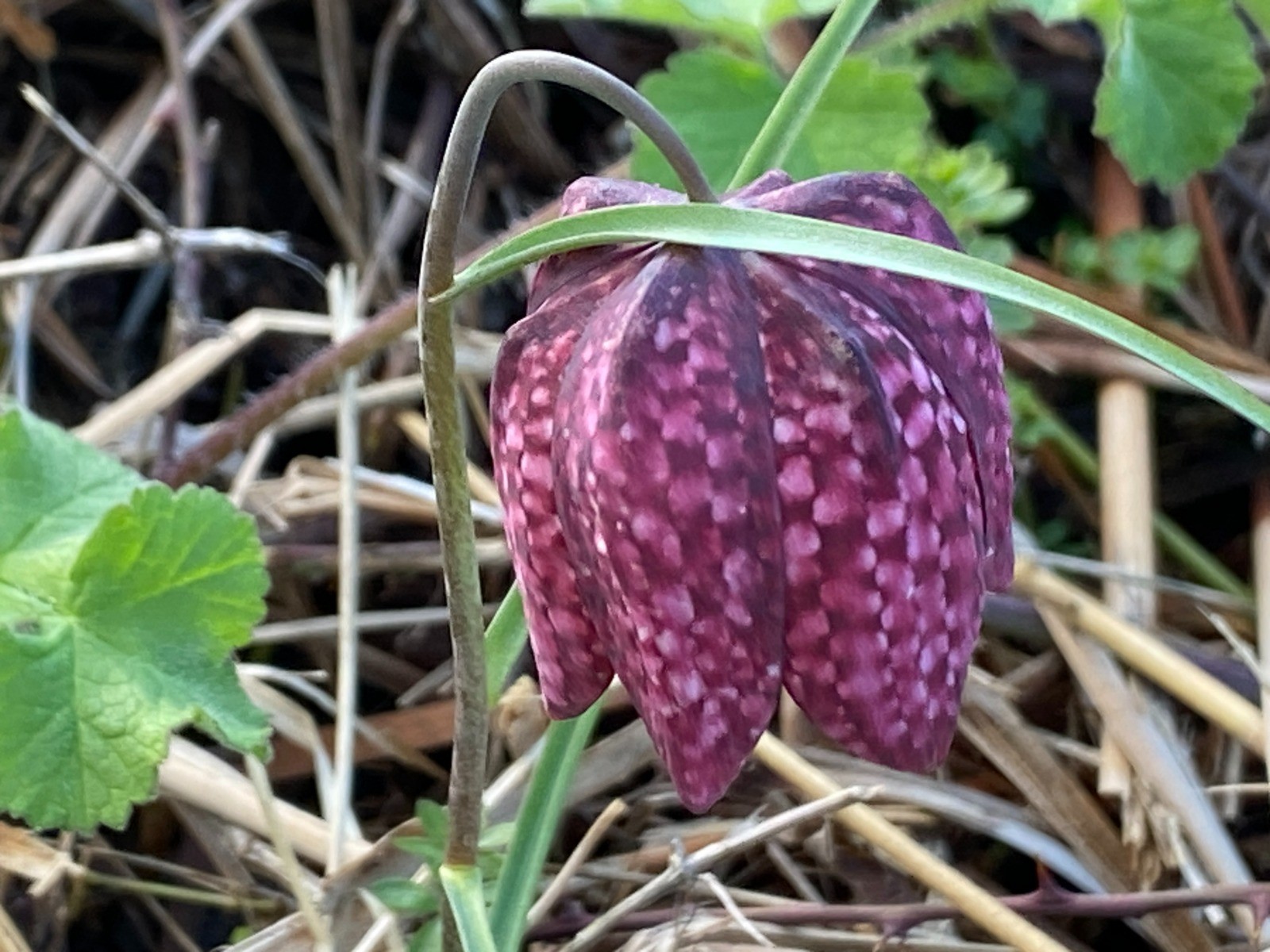 "La fritillaire pintade ou oeuf de vanneaux ( fritillaria meleagris) est facile à reconnaître avec ses gracieuses clochettes et ses corolles pourpres.