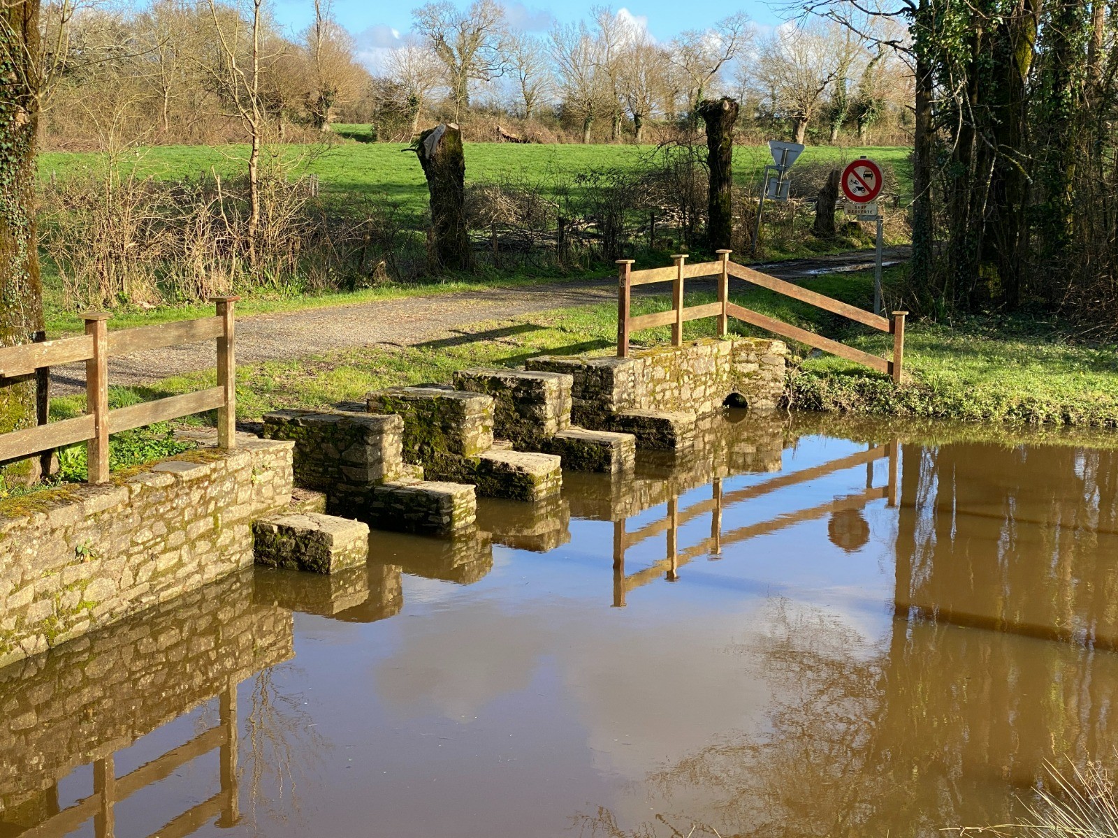 La suite a lieu sur des chemins bordés de haies bocagères et de prairies ouvertes