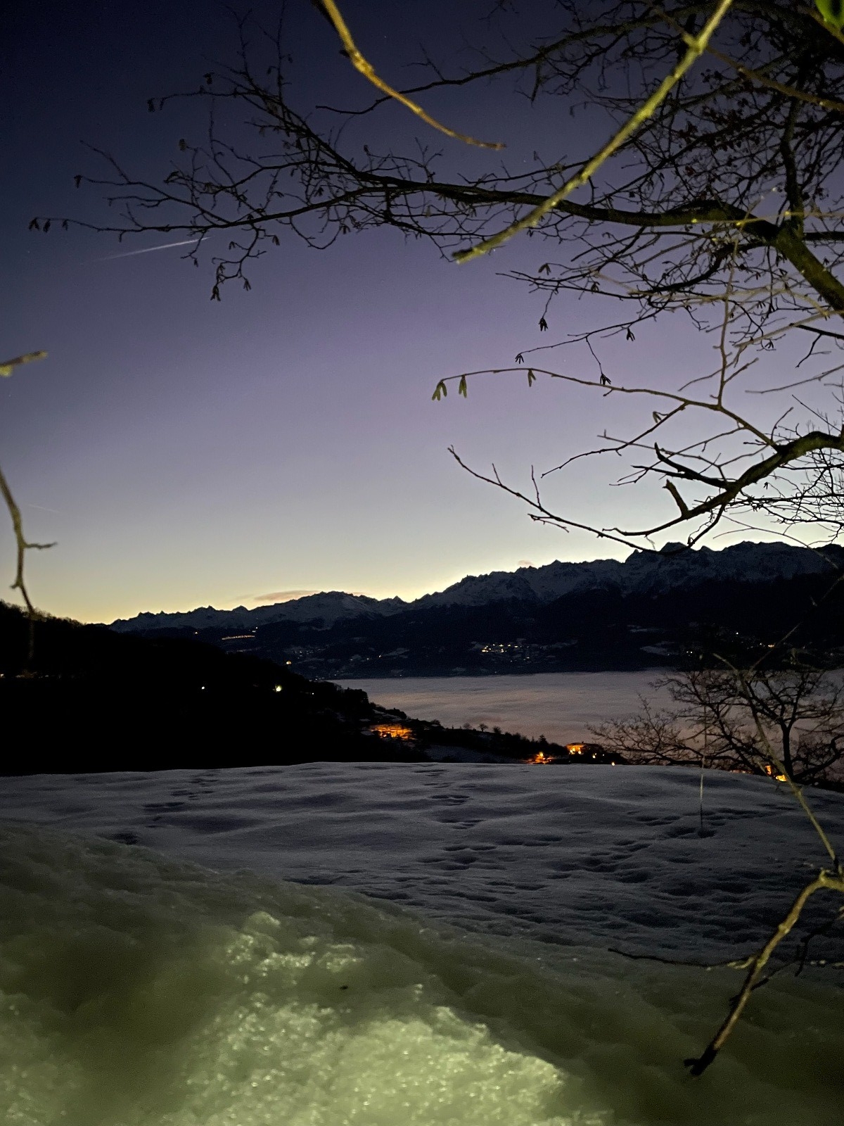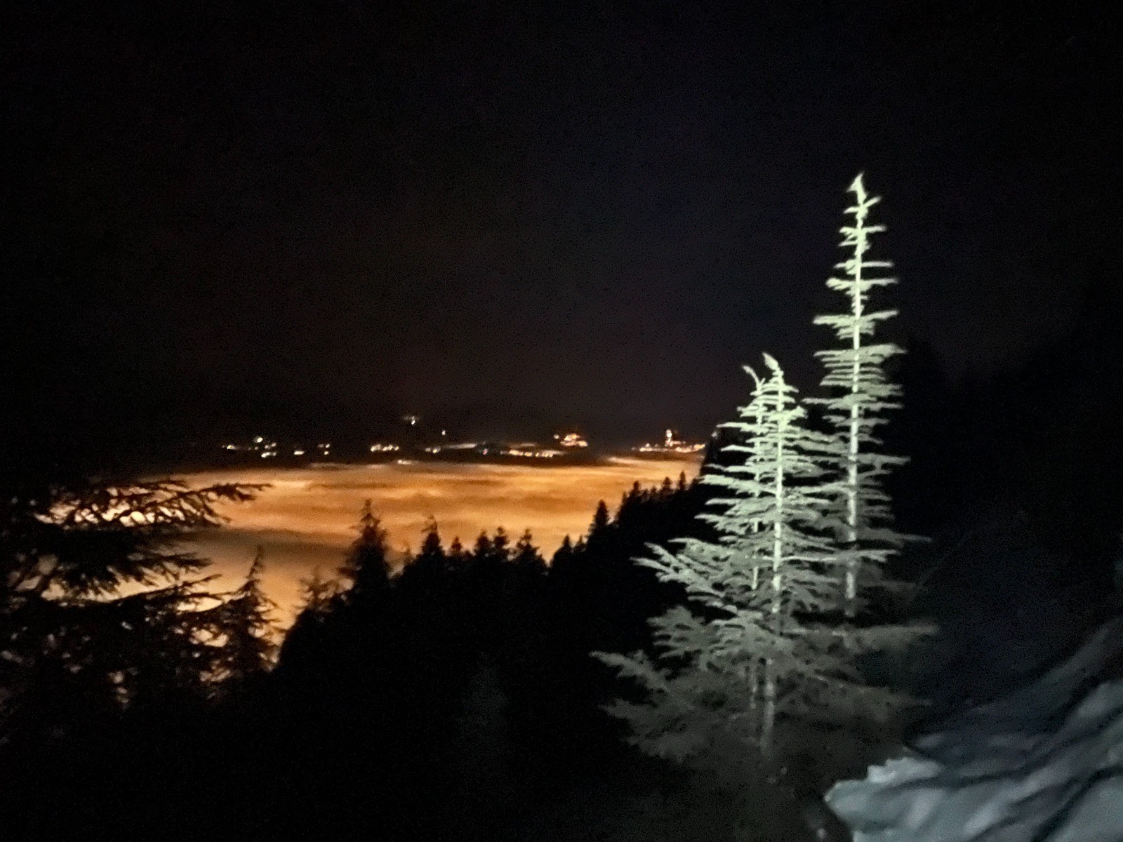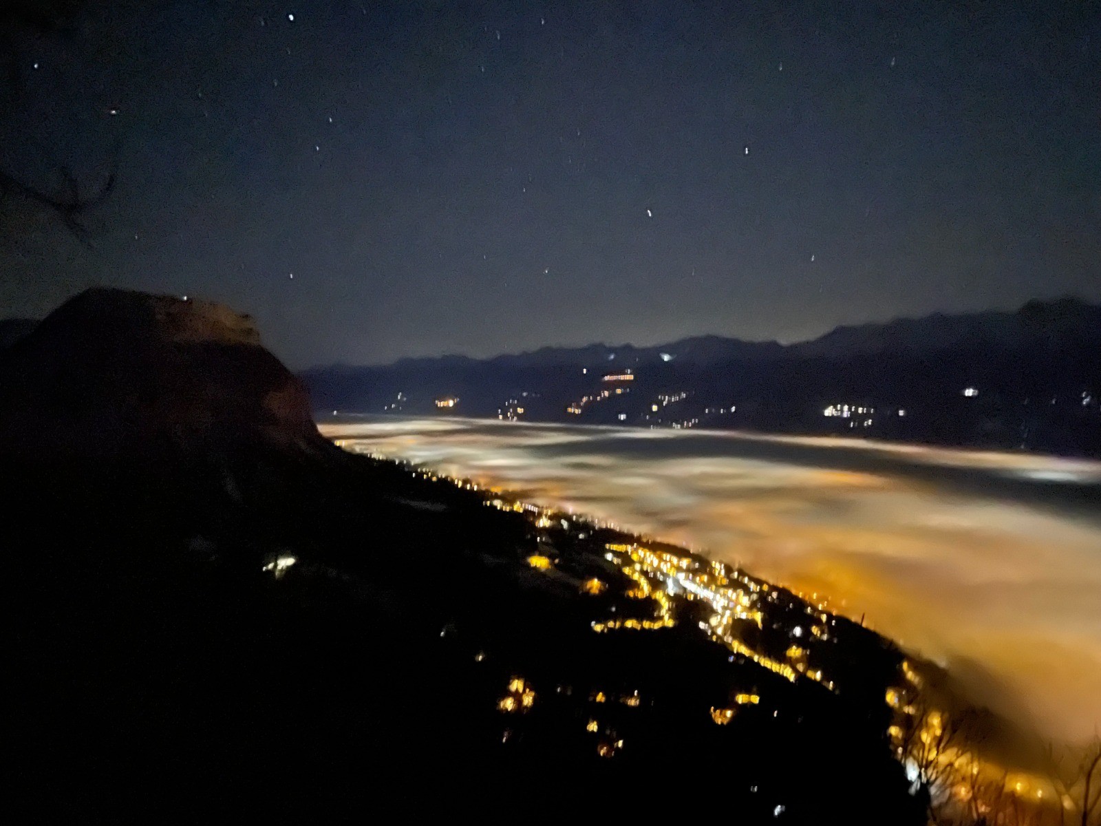 Beaucoup de neige et de glace, mais une mer de nuage sublimee par les lumieres de Grenoble