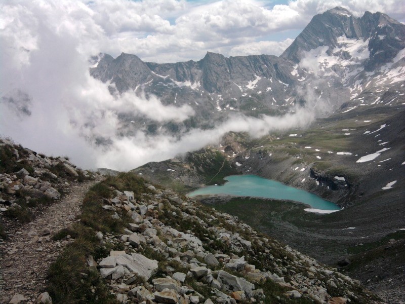 au départ du parking du pont de la peche 1760 m , refuge du roc de la peche , refuge Peclet Polset 2474 m , lac blanc , col du soufre 2819 m , D+ 1130 m