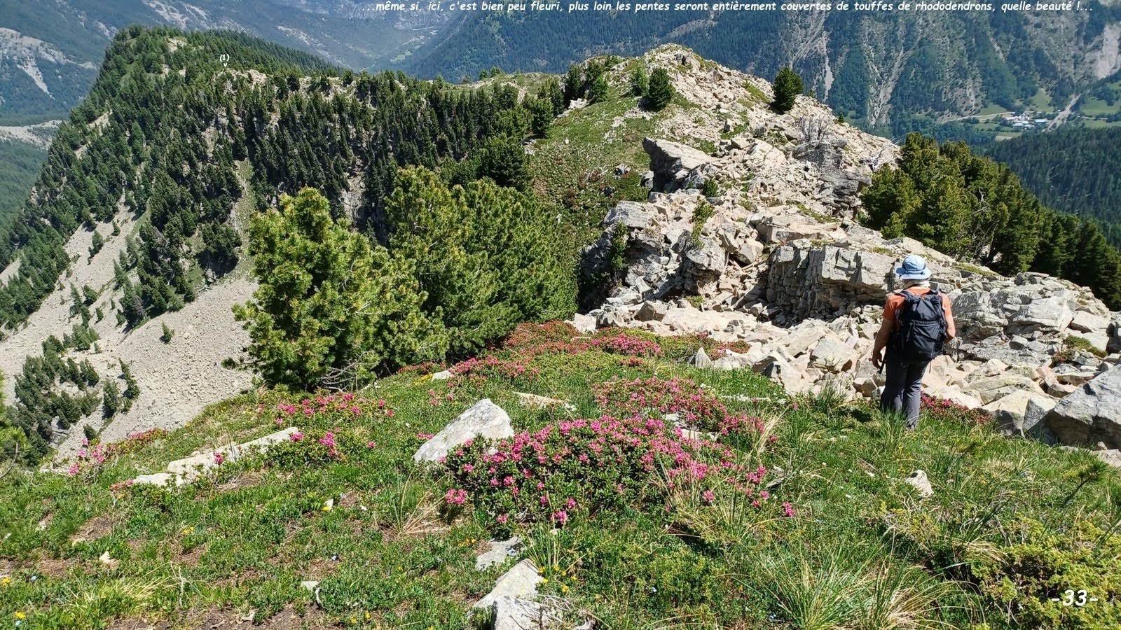 Ma lenteur ayant laissé tout le loisir nécessaire à l'Ours d'évaluer la faisabilité d'un retour par la Crête des Cimes, les 2 barres rocheuses à traverser paraissant ne pas devoir poser problème, c'est avec beaucoup de plaisir que nous avons complètement changé de décor : plus d'arête effilée au calcaire feuilleté pour, au contraire, un bon granit bien râpeux et des rhododendrons en pleine floraison à perte de vue; n'en concluez pas pour autant qu'il s'agit d'un parcours facile, ô non ! même s'il n'est pas très compliqué,le franchissement des 2 barres principales et des chaos rocheux qu'elles dissimulent ne sont pas de tout repos, même quand on n'a qu'à se préoccuper de ses chevilles en suivant les pas d'un vieil Ours rompu à ce genre d'exercice, et que dire de la traversée de retour vers notre départ, pour laquelle même lui a reconnu que, sans le suivi de trace sur son SM, nous en aurions encore sûrement bavé !