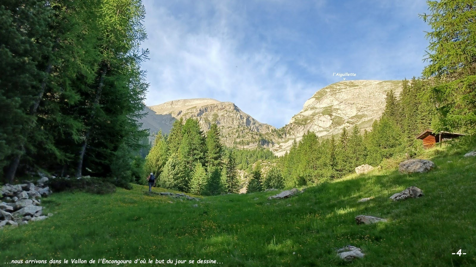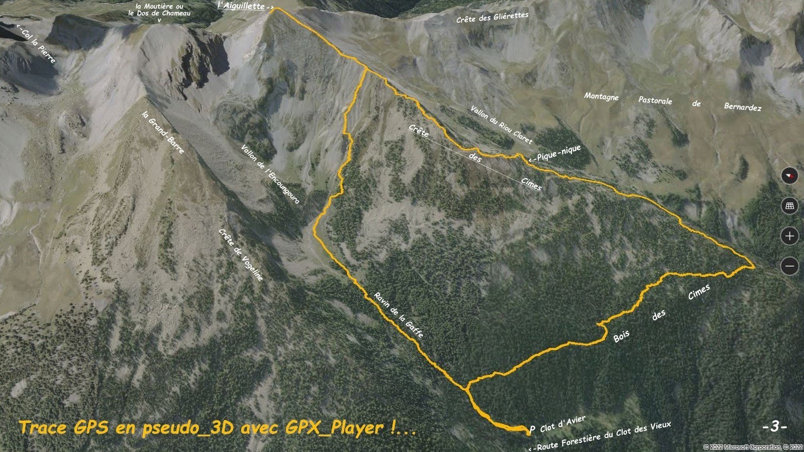 depuis le Clot d'Avier au terminus de la Route Forestière du Clot des Vieux, à droite après les antennes sur celle du Col la Pierre, carrossables et bien entretenues même s'il faut rester très attentif aux nombreux et profonds retours d'eau qui les caractérisent > continuer par la piste de débardage fortement dégradée jusqu'à ce qu'elle s'écarte franchement sur la droite de la rive gauche du Ravin de la Gaffe > remonter au mieux ce ravin par une sente pas très bien marquée et bien encombrée en louvoyant d'une rive à l'autre jusqu'à la magistrale cuvette quasi-circulaire du fond du particulièrement austère et envoûtant Vallon de l'Encoungoura aux 2 micro-cabanes en bien piteux état > de là, l'itinéraire évident consiste à rejoindre le collet entre l'arête Nord-Est de l'Aiguillette (la moins abrupte des 4 !) et la plus méridionale des barres rocheuses de la Crête des Cimes en remontant le plus naturellement du monde la coulée verte qui y conduit (notre trace s'en écarte 2 fois, la première à droite pour tenter de rester à l'ombre des arbres le plus longtemps possible, très vite dissuadés par la profusion de genévriers rampants, la deuxième par la nervure de gauche pour bénéficier de sa ventilation et éviter le coup de chaleur sous la barre rocheuse !) > suivre l'arête au plus près de son fil jusqu'au sommet, elle débute par un ressaut assez impressionnant de grandes dalles inclinées au profil acéré (