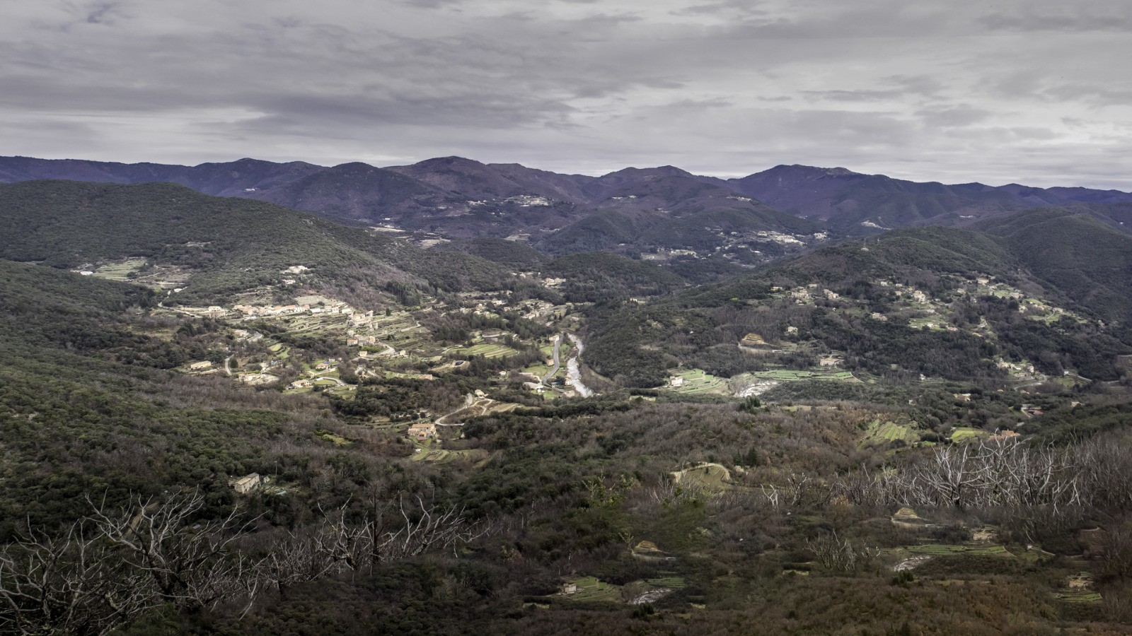 Randonnée cévenole des Pousse-Cailloux sur des chemins divers et variés, au départ de Mandagout, traversant Arboux, Camias, la Rouvierette, visuel en balcon de St André de Majencoules, menhirs, col de Peyrefiche, etc..