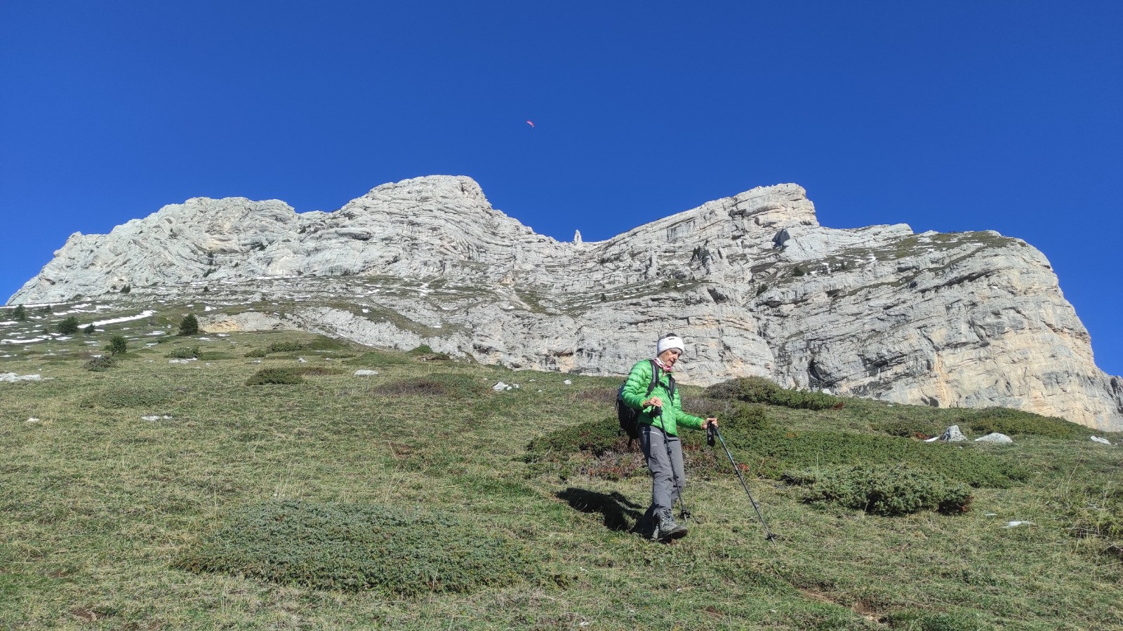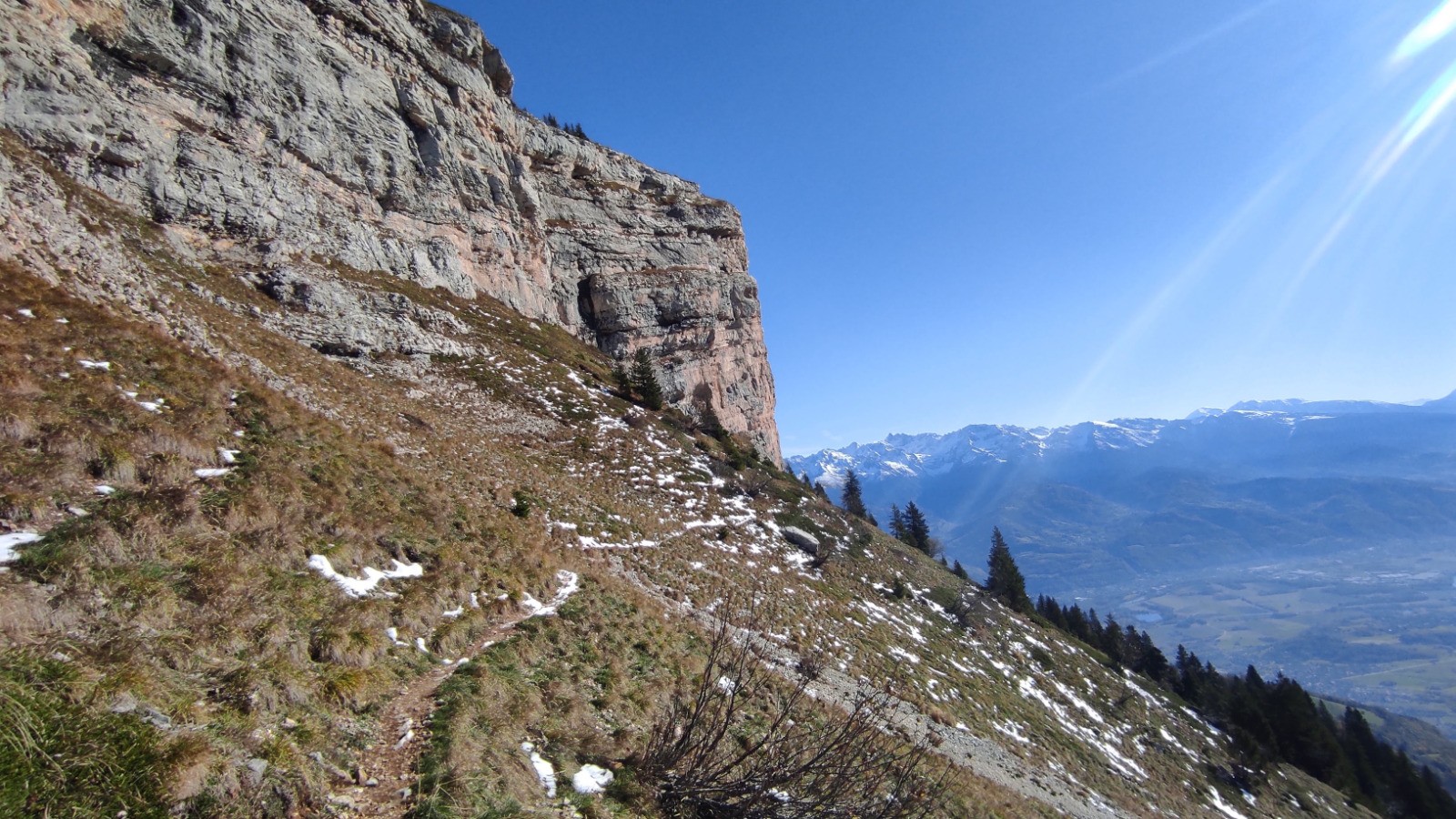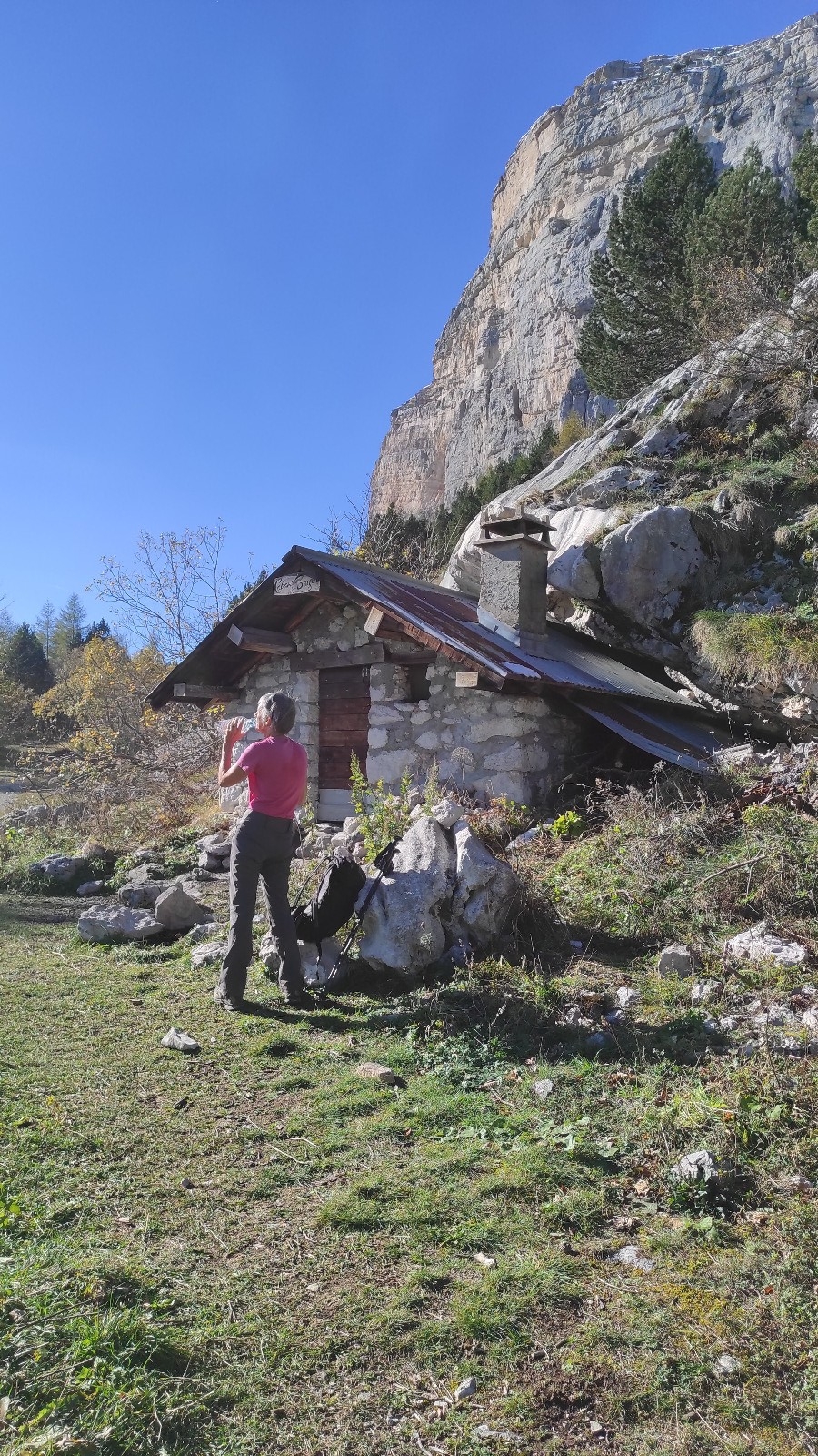 Avec Sylvie, en partant de St Pancrasse et passant par la cabane du berger, petit coup d’œil à l'entrée de la grotte Annette, souvenir de notre traversée sous terre depuis le trou du Glaz. Un chamois nous observe avant le pas des Terreaux. Le passage est beaucoup mieux sécurisé que la dernière fois ou nous l'avions fait.