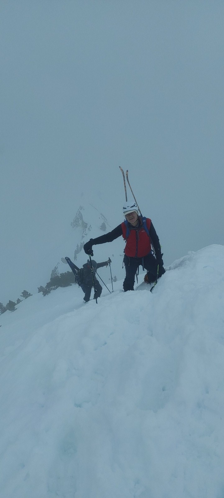 De nuageux, le temps passe au brouillard de plus en plus dense. Nous passerons deux bonnes heures sur la crête dans une purée de pois intégrale, à manger et attendre une éclaircie, qui ne viendra pas assez franche, avec un neige trop molle pour être sécurité pour redescendre par Bellefont comme prévu.