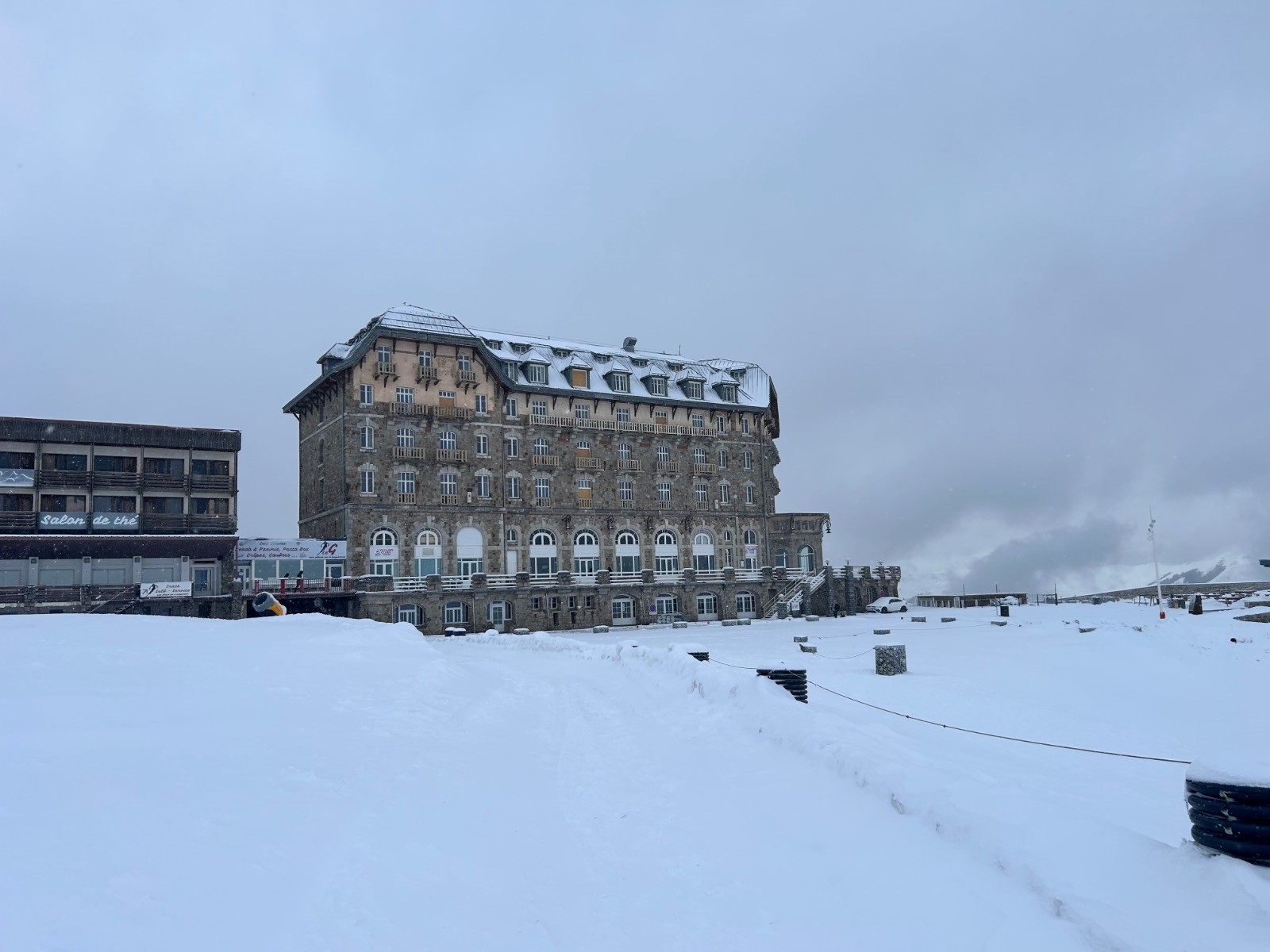 Après de fortes chutes de neige, cette nuit, la station de Superbagnères est fermée. Nous décidons cependant de faire une balade digestive pour rejoindre la gare d’arrivée du téléski d’Arbesquens. le vent et la neige ne nous épargnent pas. La visibilité est nulle et le vent forcit, donc nous décidons de faire demi-tour.