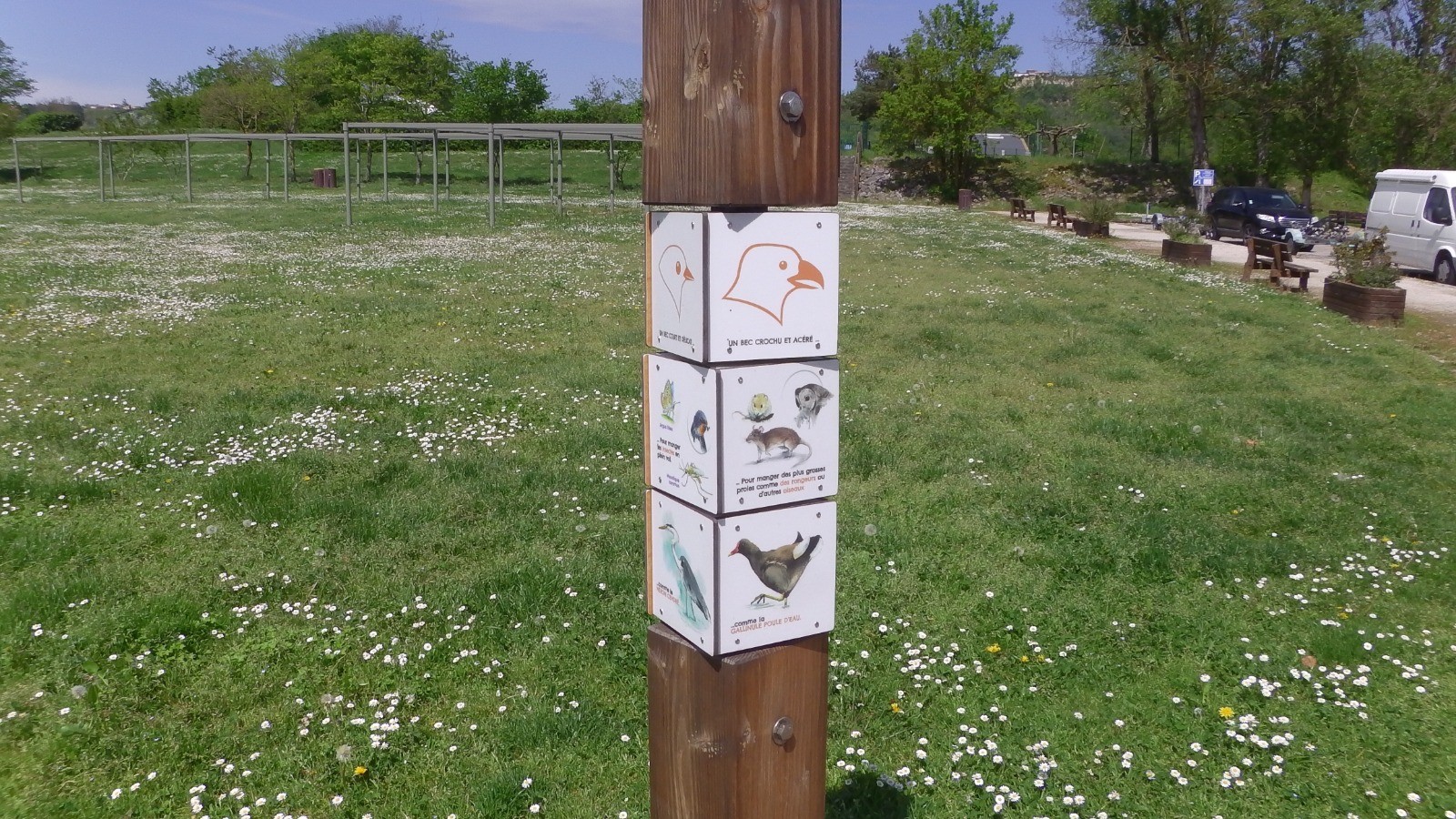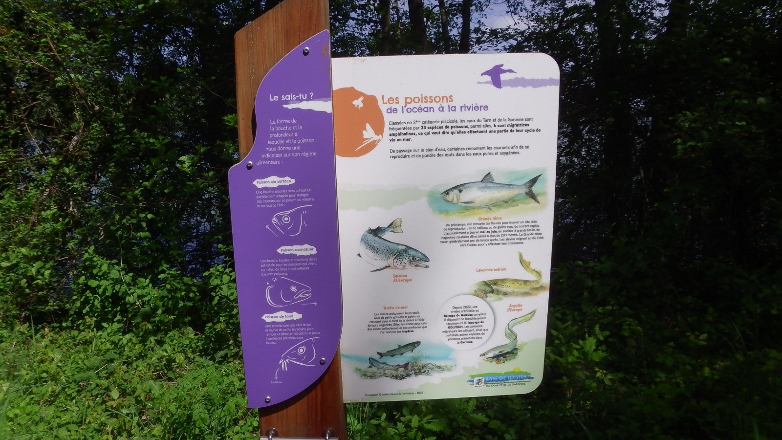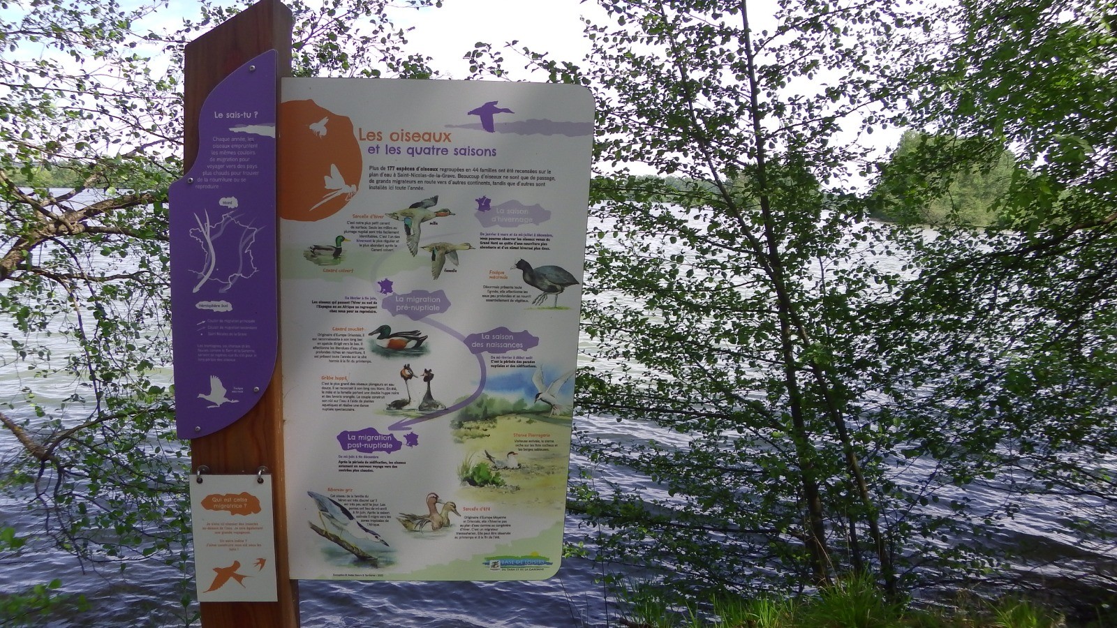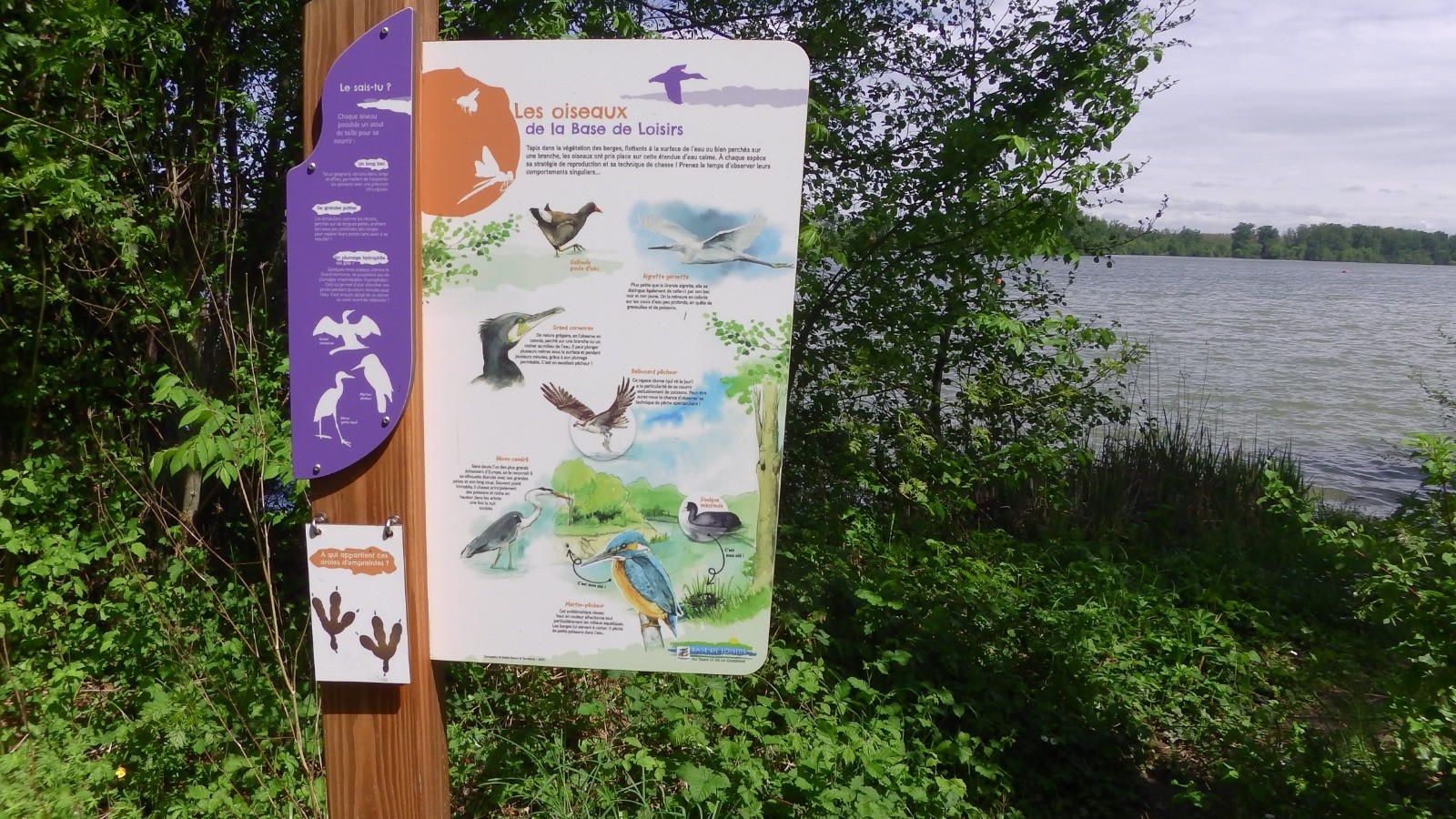 Le chemin qui longe le plan d'eau présente des panneaux explicatifs sur la vie de ce plan d'eau : oiseaux, poissons, mammifères ...