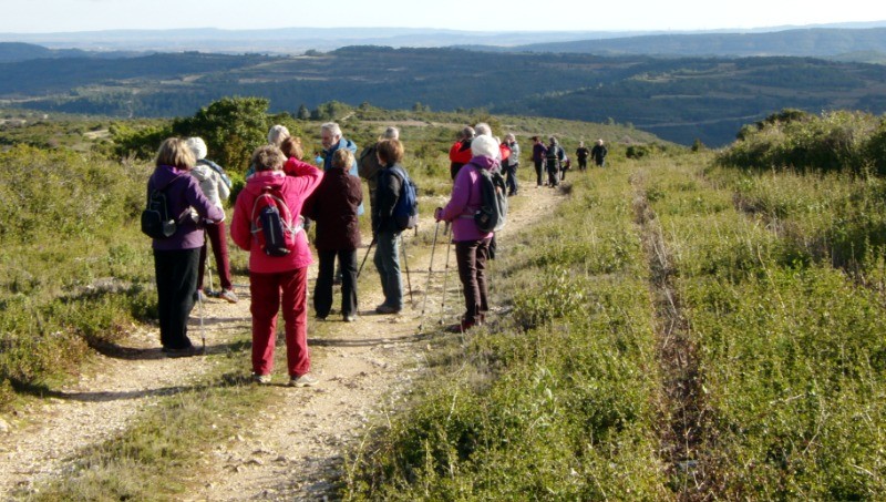 on suit la route du Bouys par de petits chemins autant à droite qu'à gauche... enfin perchés pour une vue superbe sur la vallée du Brian ... la fin du parcours est en pente douce et s'approche des dolmens de Minerve, les souvenirs de la tribu... les rochers plantant leurs mâchoires dans les nuages dominent un superbe panorama.