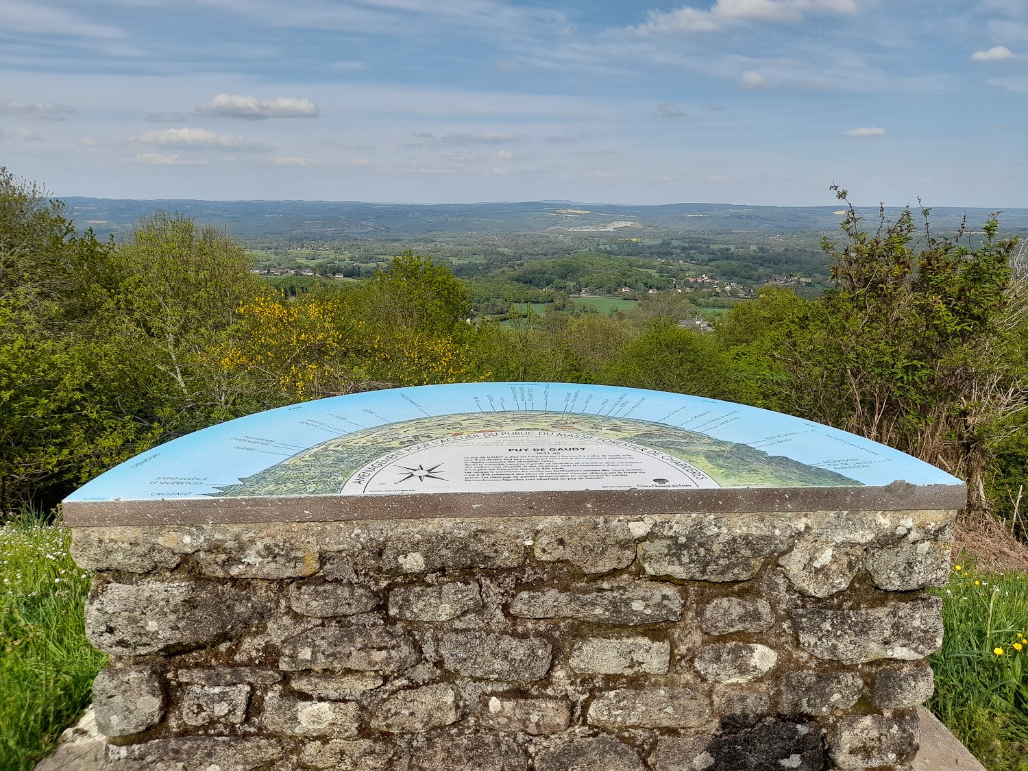 Un petit crochet par le Puy de Gaudy, sur le chemin du retour. Quelques jacinthes des bois avant d'accéder au site. A retenir le Moulin, le Dolmen et la Nécropole. Sur le retour, la table d'orientation avec une superbe vue sur la campagne Guéretoise.