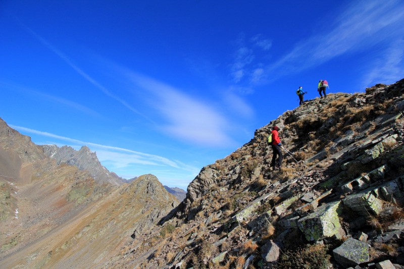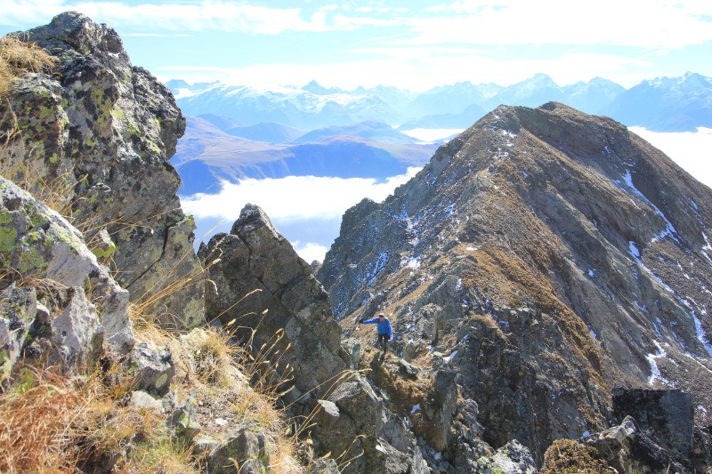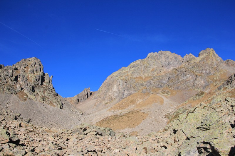 La grande Roche par l'Ouest. Longer les crêtes jusqu'à un couloir (terre/pierre) plein Ouest que l'on descend pour rejoindre le col à 2459 (Kern) . La suite est hors sentier, en pierres souvent instables jusqu'au chemin qui va à