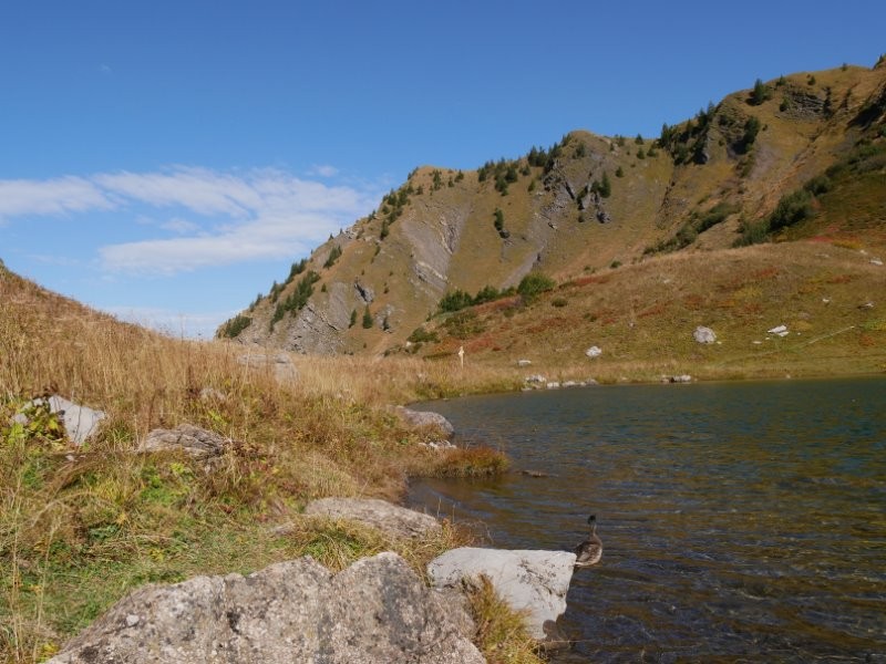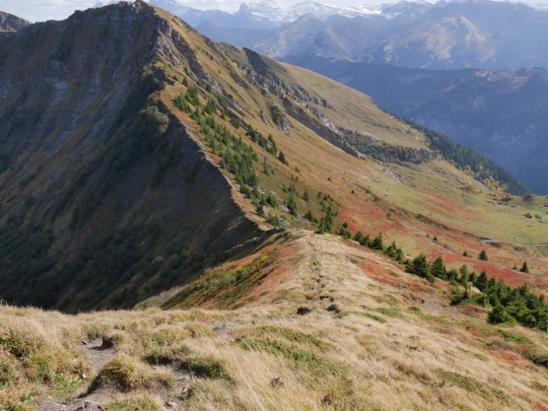 Descente par l'itinéraire classique, le Col de Tavaneuse (1997m), le lac (1810m) et les chalets de Tavaneuse.