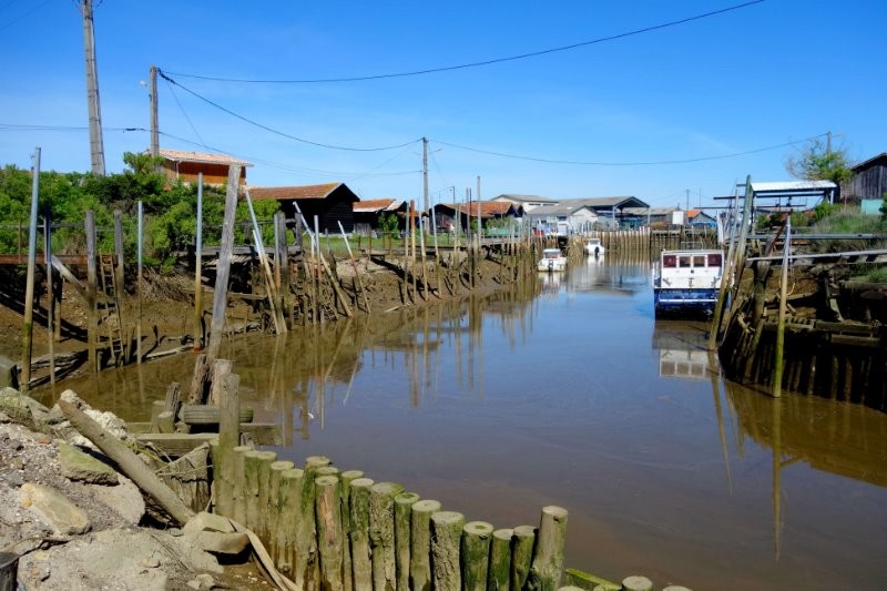 Premières cabanes en bout d'Arcachon, après Le Moueng, premier sentier et dépaysement garanti à cet endroit, le circuit suivra une bonne partie du grp tour du bassin d'Arcachon. L'activité ostréicole est bien présente, les huîtres du bassin sont renommées (à juste titre), nombreux sont les ports ostréicoles typiques, notamment à la Teste de Buch ou à Gujean-Mestras. Un superbe sentier longe le bras de l'Eyre, on se retrouve entre bassin, marais et rivière, le sentier est ensuite interdit aux vélos. On passe en sous-bois pour arriver tout au bout du bassin du côté de Biganos. J'ai ensuite cherché à rester au plus près des rives du bassin, la trace traverse de superbes coins sauvages où nichent de nombreux échassiers et migrateurs. Le coin est aussi très prisé des chasseurs, de nombreuses cabanes d'affût sont installées là, circuit à éviter en période de chasse ...