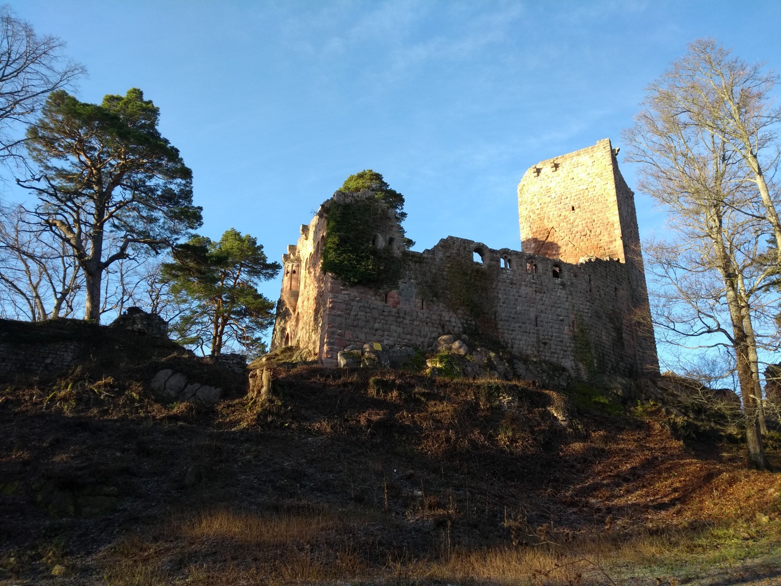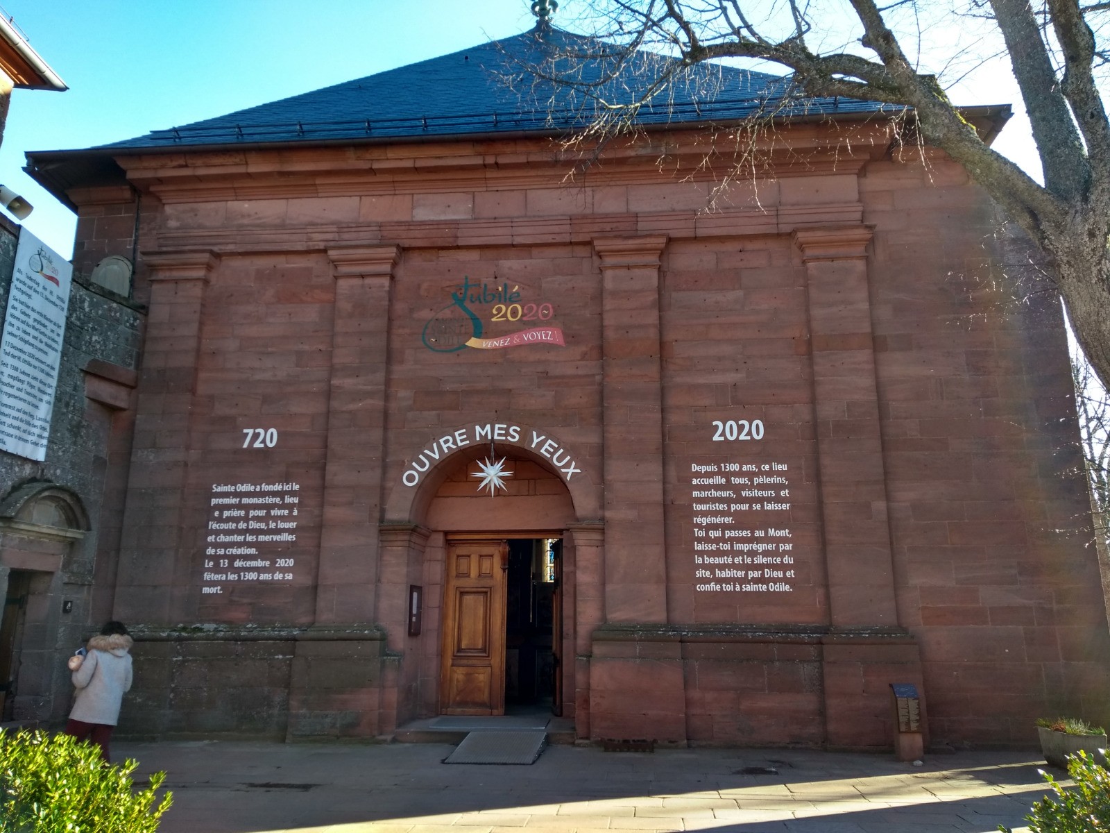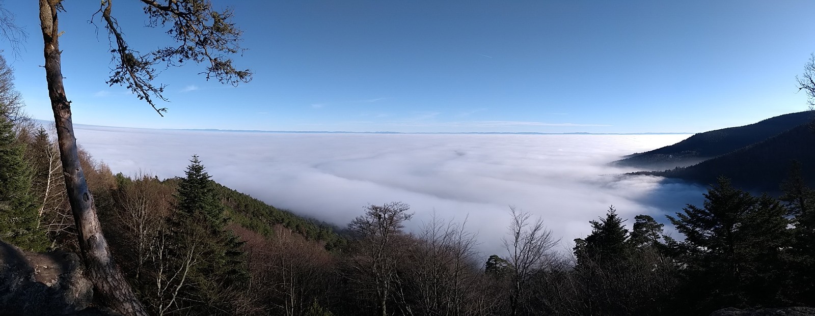 Mont Sainte Odile (parking P3) - Kiosque Jadelot - Château du Landsberg - [hors piste à 3.7 km] - Kapellenhausfelsen - Maennelstein - Sentier du Mur Païen - Grotte des Druides - Rocher du Panorama - Chemin de Croix - Mont Sainte Odile (couvent) - Sentier du Mur Païen - Porte Romaines - Grotte d'Etichon - [sentier en surplomb avec 2 points de vue] - [demi-tour pour retrouver une paire de lunettes à un croisement de sentiers] - Porte Nord - Hagelschloss - Porte Koeberlé - Château de Dreistein - Maison forestière du Willerhof - Birkenfels - Mont Sainte Odile (parking P3)