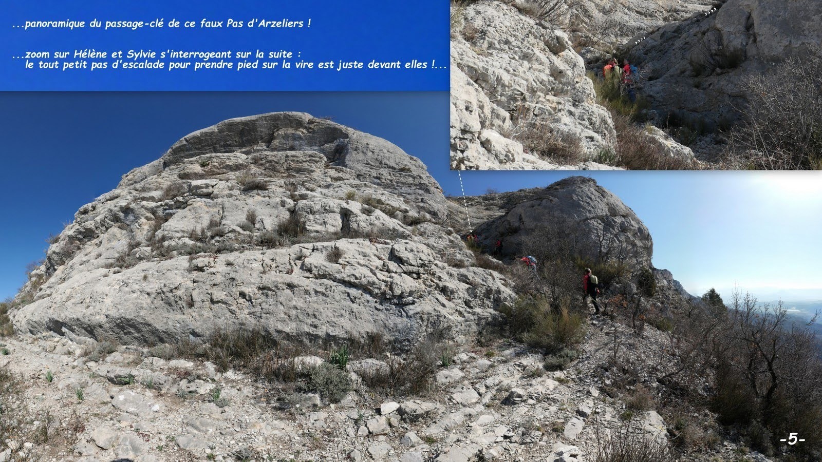 depuis P1, dernière bifurcation avant Colombe (ultime limite jusqu'où peut s'aventurer à l'improviste un randonneur prudent !) > suivre la piste qui franchit le Torrent des Casses, traverse Serre de Criau > poursuivre par le sentier et franchir le Torrent de Criau pour revenir sur l'excellent sentier qui court sur la crête transversale cotée 751m au bout de laquelle il rejoint une piste qu'il suffit de suivre jusqu'à Jubi (par respect pour le propriétaire et son chien, mieux vaut contourner largement pour rejoindre le carrefour de pistes au Sud-Est) > poursuivre vers l'Est sur quelques m et prendre le sentier plein Nord à gauche (petit cairn et vieille balise jaune) > naviguer au mieux en restant le plus près possible du champ de lavandin pour en rejoindre plus haut la piste forestière qui venant de Jubi lui fait suite > la suivre jusqu'à son terminus d'où part le sentier balisé du Pas d'Arzeliers (attention le passage ainsi balisé rejoint la crête bien plus à l'Est que le Pas figuré sur la Top 25 de l'IGN !?), il franchit la barre rocheuse par un tout petit pas d'escalade (2a maxi !) suivi d'une diagonale ascendante facile et sûre > de là, pour le spectacle ! nous avons négligé la sente bien cairnée qui conduit directement à la crête pour poursuivre le plus longtemps possible sur une vire à chamois restant au plus près du haut de la falaise de plus en plus aérienne > aller-retour par le sentier de crête désormais parfaitement débroussaillé jusqu'au-delà de la cote 1270m, face au dôme des Clots et la falaise du Colombier > retour par tout ce magnifique et spectaculaire sentier de crête jusqu'à la Porte Sereine > descente sur P2 (la Marmotte et son précieux taxi ayant tout fait pour nous éviter l'épreuve du macadam !), à noter que là encore le nouveau balisage de la cote 889m à retrouver l'ancien à l'Ouest des Tombes (cimetière protestant !) n'est toujours pas pris en compte par Géoportail (cette déviation étant peut-être due à une action des amis des randonneurs ?!).