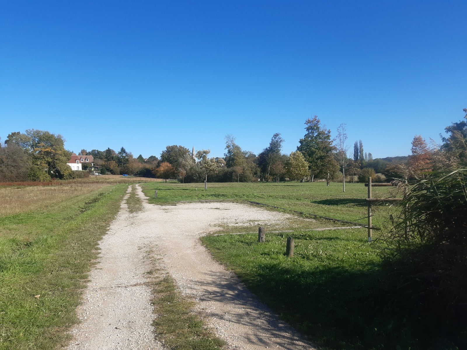 4. À un rond-point, tourner à droite, puis à gauche rue de Rochefort. (👁 avant de tourner rue de Rochefort, continuer tout droit sur 50 m pour voir le château de Gourville). Passer sous l’A 11, puis sous le viaduc d’une ancienne voie ferrée. Avant d’entrer dans Prunay-en-Yvelines, suivre le chemin à droite longeant le ru du Perray.