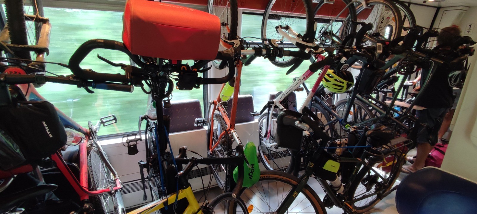 Départ hier de Crolles aprés avoir confié notre jardin à Marie. Pas de soucis pour les trajets en train jusqu'à Lyon. Ça se corse pour prendre celui pour Nevers. Quatre mn d'arrêts prévus seulement, le train part de pardieu, et le quai affiché au dernier moment. Un petit train et beaucoup de monde et beaucoup de cyclistes. Heureusement, le jeune contrôleur est très sympa et organisé tout.