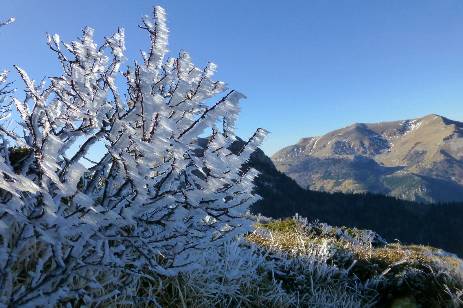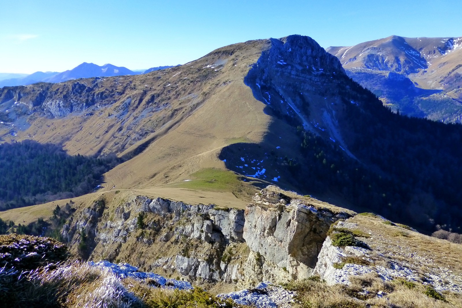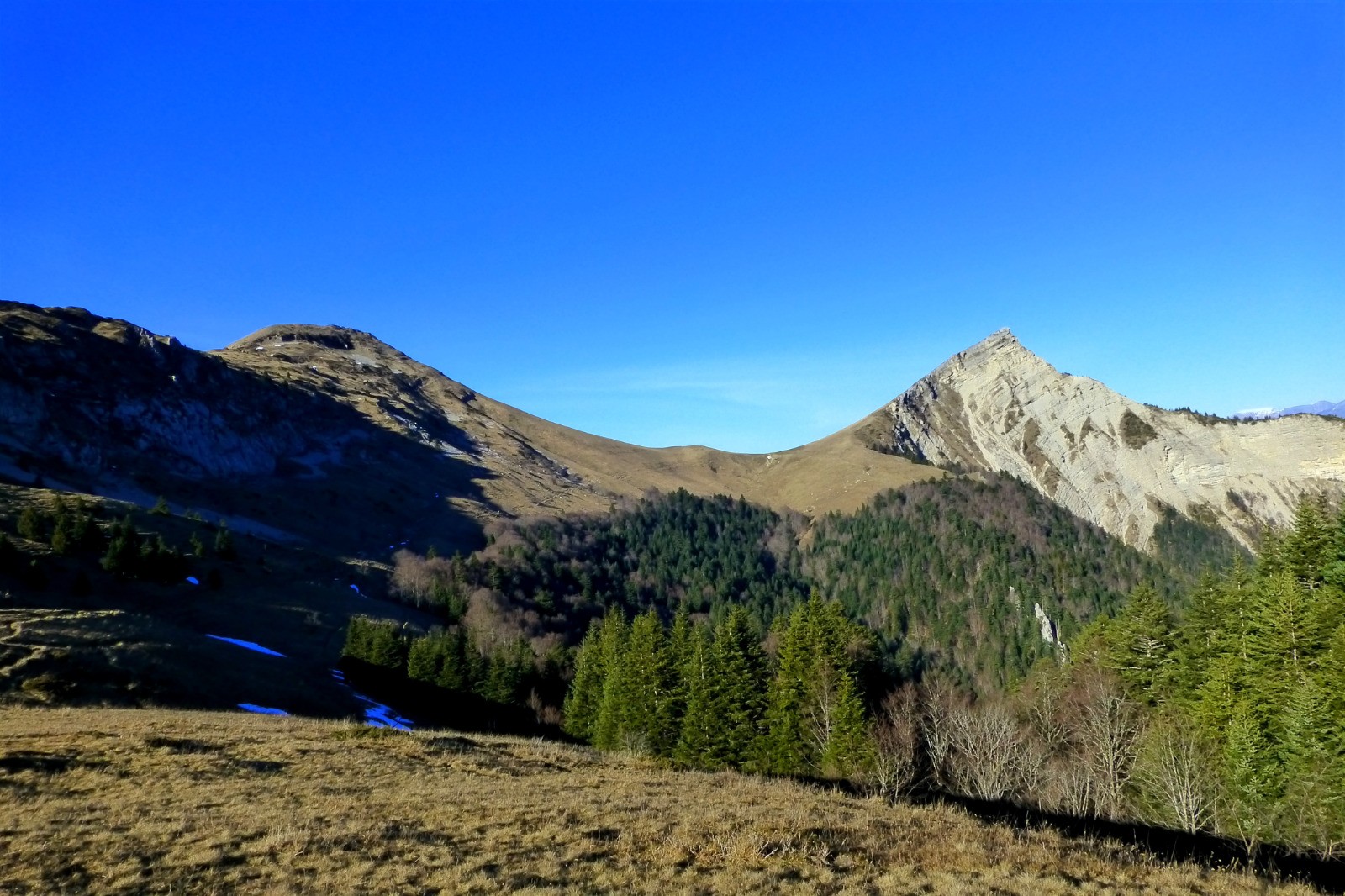 Deux petits sommets du Sud-Trièves intégrés dans une longue boucle dominée par l'impressionnante et toute proche barrière du Dévoluy.