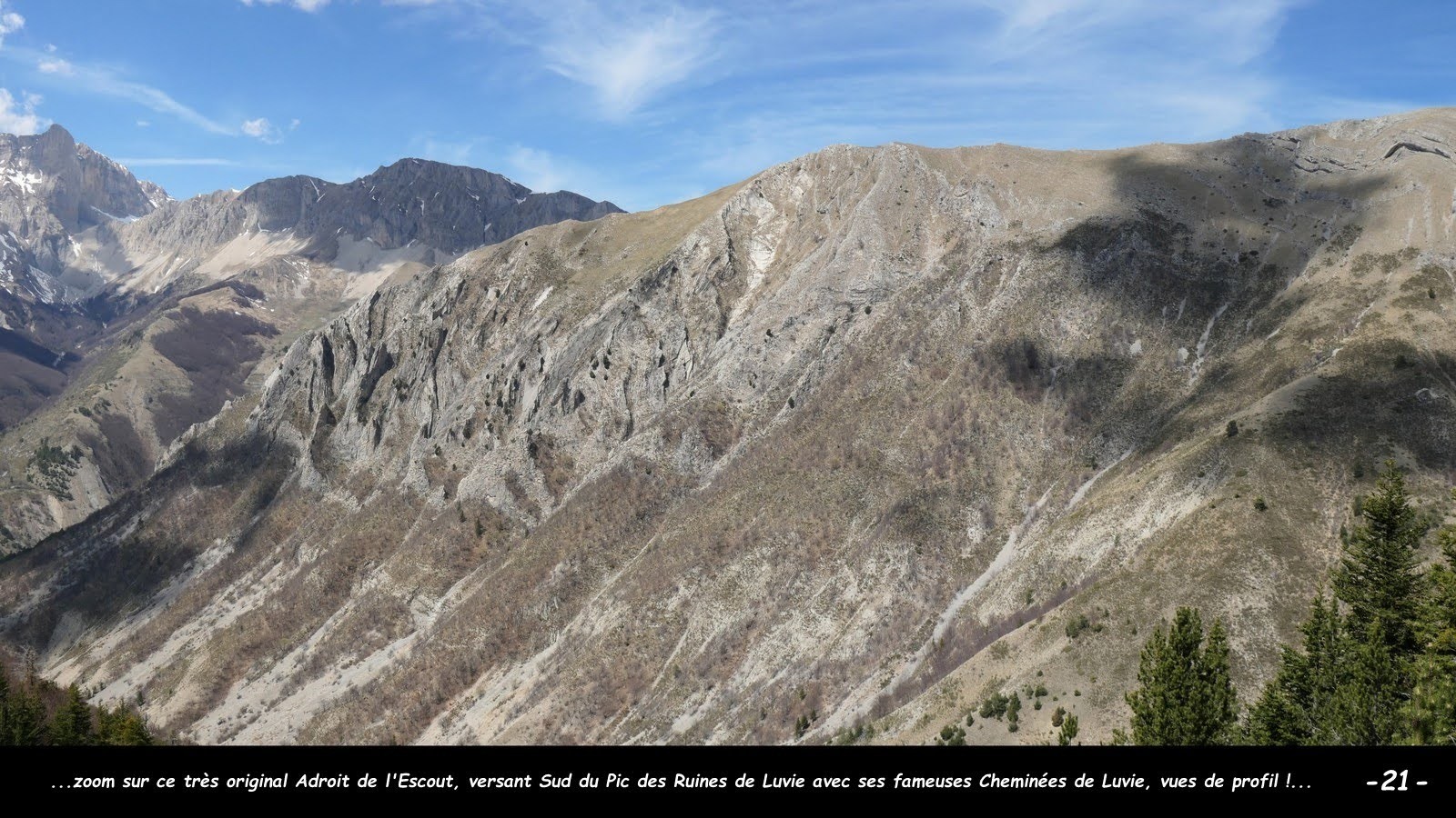 3D (sur laquelle, vu sous cet angle, le Pic Melette révèle la quasi parfaite géométrie de sa silhouette au centre de l'impressionnant cirque de Chaudun), avait repéré les étranges singularités géologiques des Ruines, le Pic des Ruines et les Cheminées de Luvie à l'Adroit de l'Escout où il nous a accompagnées pour une première approche en
