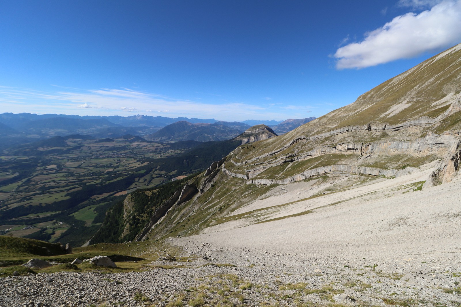 Environ 80 m plus haut, on traverse pour franchir la croupe, la pente se calme et quelques cairns indiquent que des bipèdes sont passés par là!