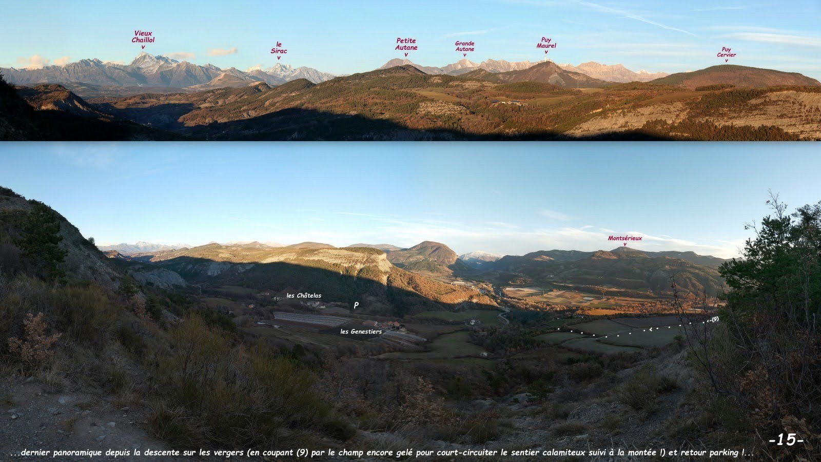 Heureusement que la suite de cette crête, malgré un passage très aérien, étroit, gravillonneux et en descente, était très originale, un étonnant et assez innatendu dépaysement. La suite vers Ville Vieille, plus classique, reste malgré tout intéressante, tout comme la pittoresque traversée du ravin du Riou et le retour tout en balcon par les GR 93 - 653D et GRP entre Céüse et Durance, jusqu'à sa jonction avec notre itinéraire du matin, repris en sens inverse jusqu'au parking où nous sommes arrivés quasiment au coucher du jour, content de retrouver le confort du Duster.