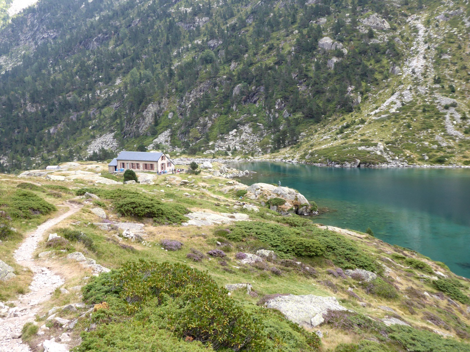 Temps mitigé pour aller voir trois beaux lacs dans la vallée du Lutour. Le premier est le lac d'Estom. Le lac d'Estom est situé 1803 m, il a une surface de 5,9 ha et une profondeur de 18 m. Situé dans un massif granitique et alimenté par les eaux du gave d'Estom-Soubiran, il donne naissance au gave de Lutour.Le second est le lac du Labas à 2279m , il a une surface de 5,7ha et il est profond de 25m.Le troisième est celui d'Estom Soubiran, situé à 2360 m, il a une surface de 7,4 ha et une profondeur de 45 m. Les pics majeurs autour sont celui du Labas 2946m et celui de la Sède 2976m. Belle rencontre un après la Fruitière avec de nombreux isards et leurs petits .