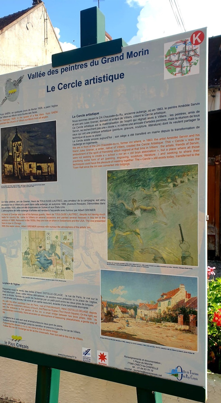 1. De la gare, suivre à gauche la rue bordée de tilleuls, traverser la rue de Bouleurs et aller en face, rue du Bon-Accueil. Poursuivre à droite par la sente des Baulnes. Emprunter à gauche le mail des Promeneurs qui longe un bras du Grand-Morin et se termine sur une route [(👁) à 1 km à gauche puis à droite (D 934), collégiale de Crécy XIIIᵉ]. Tourner à droite et suivre les rues Jean-de-Compans, du Barrois et Dam’Gilles, et franchir le Grand-Morin.