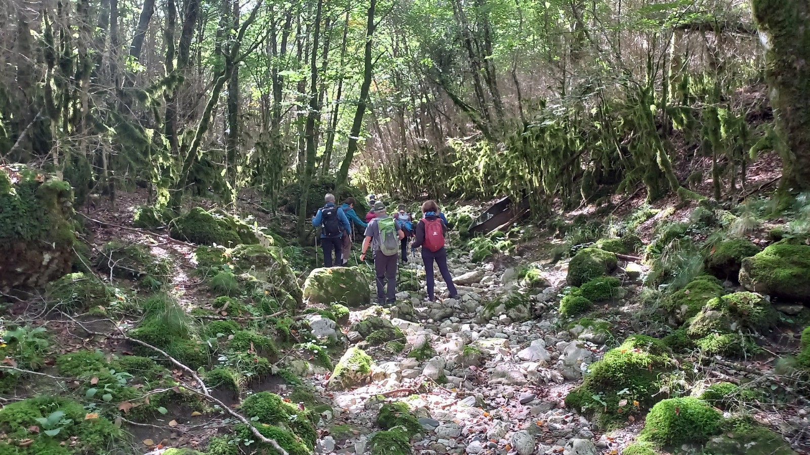 Randonnée des pousse-cailloux sur le causse de Campestre, cheminement dans le lit de la Virenque avec les éboulis de roches façonnées par la rivière, habillées de mousse à profusion, etc.. un vrai plaisir. Accueil en rentrant sur le causse par un troupeau d’ânes, des gourmandises à cueillir sur les chemins, et la traversée de chaos avant de rejoindre Sauclières.