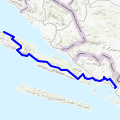 Ploce - Brela 36e étape, On prend le ferry de Orebic à Ploce, ih de traversée. Il fait froid. On suit en grande partie la D8, à partir de midi, beaucoup de voitures. On essaye de prendre le bord de mer, pas très roulant et parfois des escaliers. La pluie menace, mais on passe entre les gouttes. On s'arrête à Brela, à l'hôtel Marina.