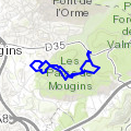 FONTMERLE LA VALMASQUE 06 MouginsDépart étang de Fontmerle au deuxième parking prendre a droite et suivre le sentier direction D35 traverser la route et prendre la direction de la maison forestière la passer et au niveau du parcourt sportif revenir vers la D35 la traverser pour aller a l'étang de Fontmerle »
