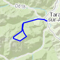Parking Traucadou-Saurat UssatEn partant du parking qui va au relais, juste au niveau du passage canadien, cette trace permet de faire la crête en VTT jusqu'au rocher de Batail et de descendre sur Saurat par les sentiers. »