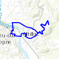 9 km avec 311 m de dénivelé positif, petites routes et chemins ( au km 5 environ, après un petit terrain de moto-cross, le chemin part à droite, balisé trait rouge dans carré blanc encombré de troncs et de ronces et relativement raide est difficile ! )