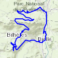 Boucle de 27 kms (parcours n°11) au départ du parking de Louvie-Juzon situé a coté du pont qui traverse le Gave d'Ossau. La première montée (identique a celle de la glissoire) de 9kms est assez rude et se termine par un quart d'heure de poussage et portage. Début de la première descente technique mais moins exigeante par la suite. La deuxième montée est plus courte et demande moins d'eff »