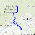 On tourne ensuite dans la boucle de l'Oise et vers la base de loisirs de Cergy. On passe sous Vauréal et vers joue le Moutiers. On se dirige ensuite vers la forêt de l'Hautil que l'on traverse pour revenir vers Andrésy et Maurecourt. Puis retour vers Conflans »
