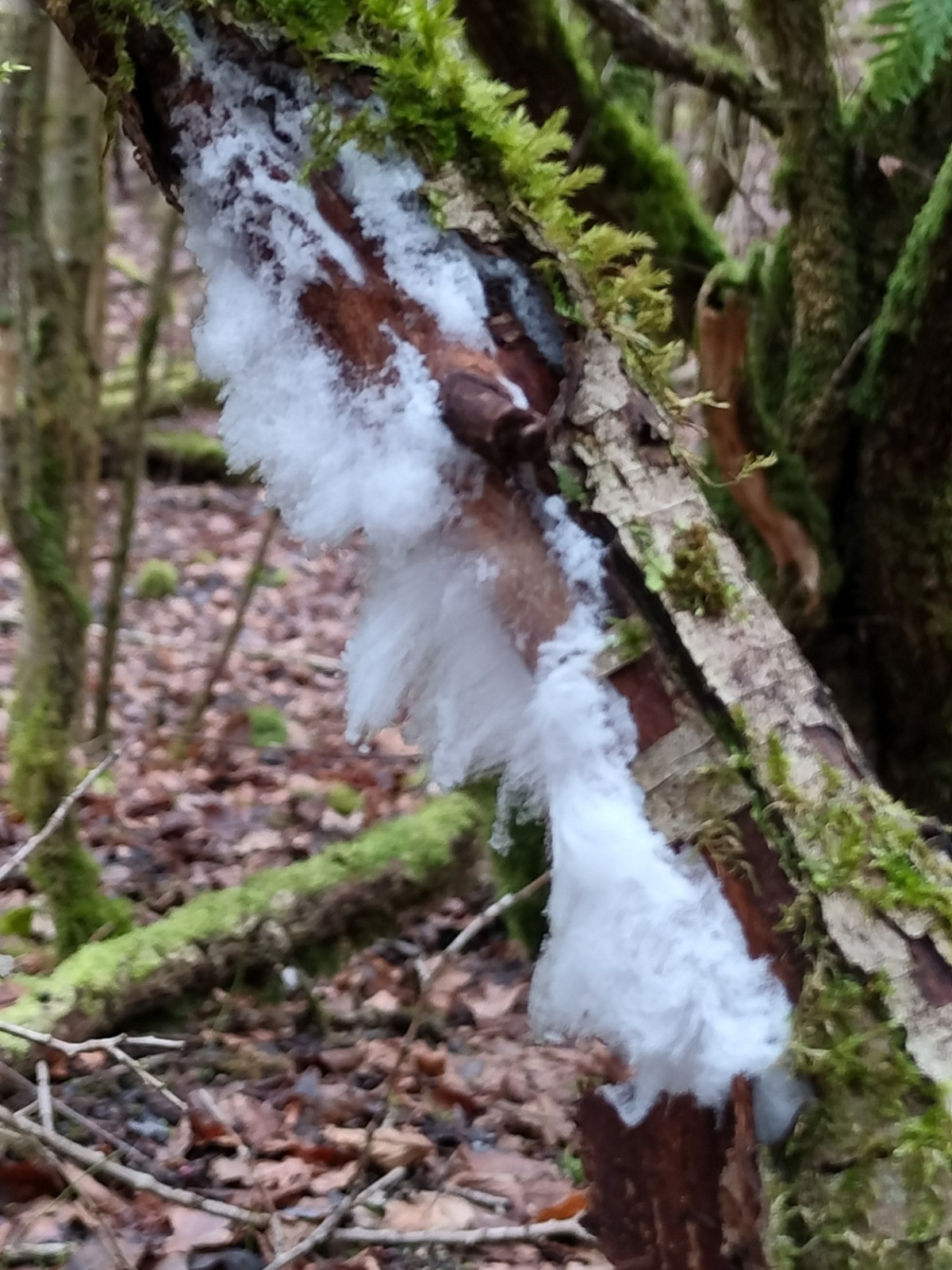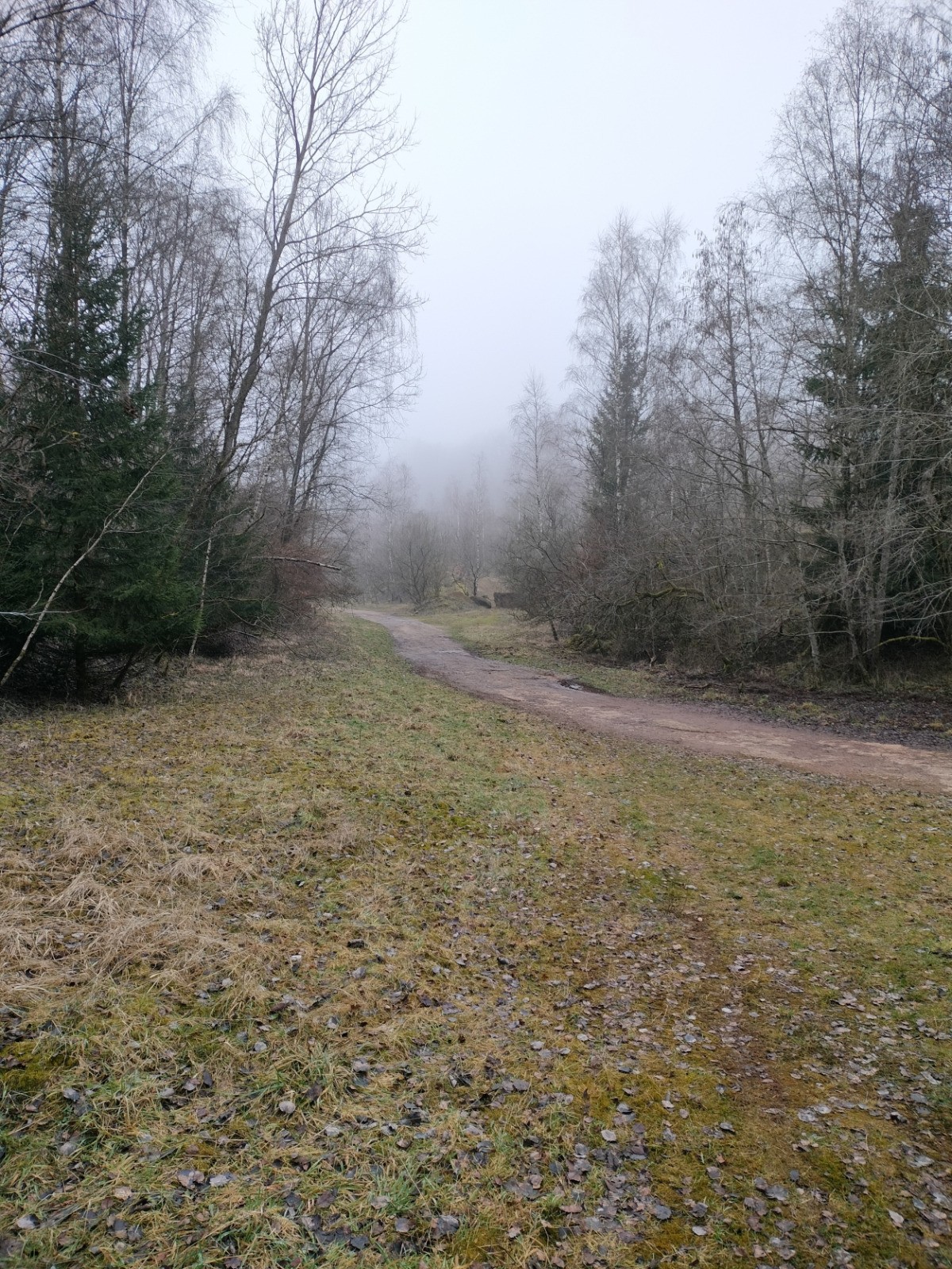 La descente vers les étangs nous immerge dans un calme profond. L’eau, à peine miroir du ciel, se trouble sous la brume ; un pêcheur glisse sa ligne dans le silence. Nous empruntons ensuite l’ancienne voie ferrée, longue ligne droite où les arbres, couverts de mousse et ceints d’un halo grisâtre, dégagent un esprit fantomatique.