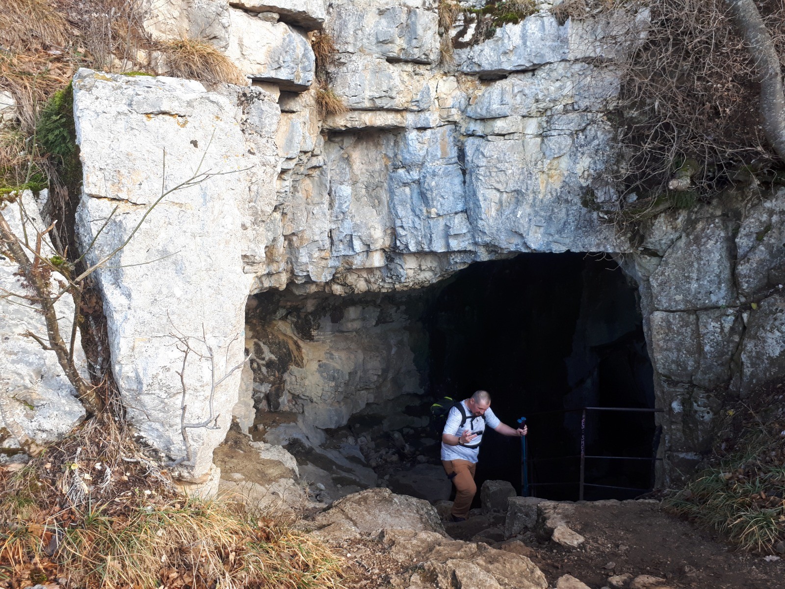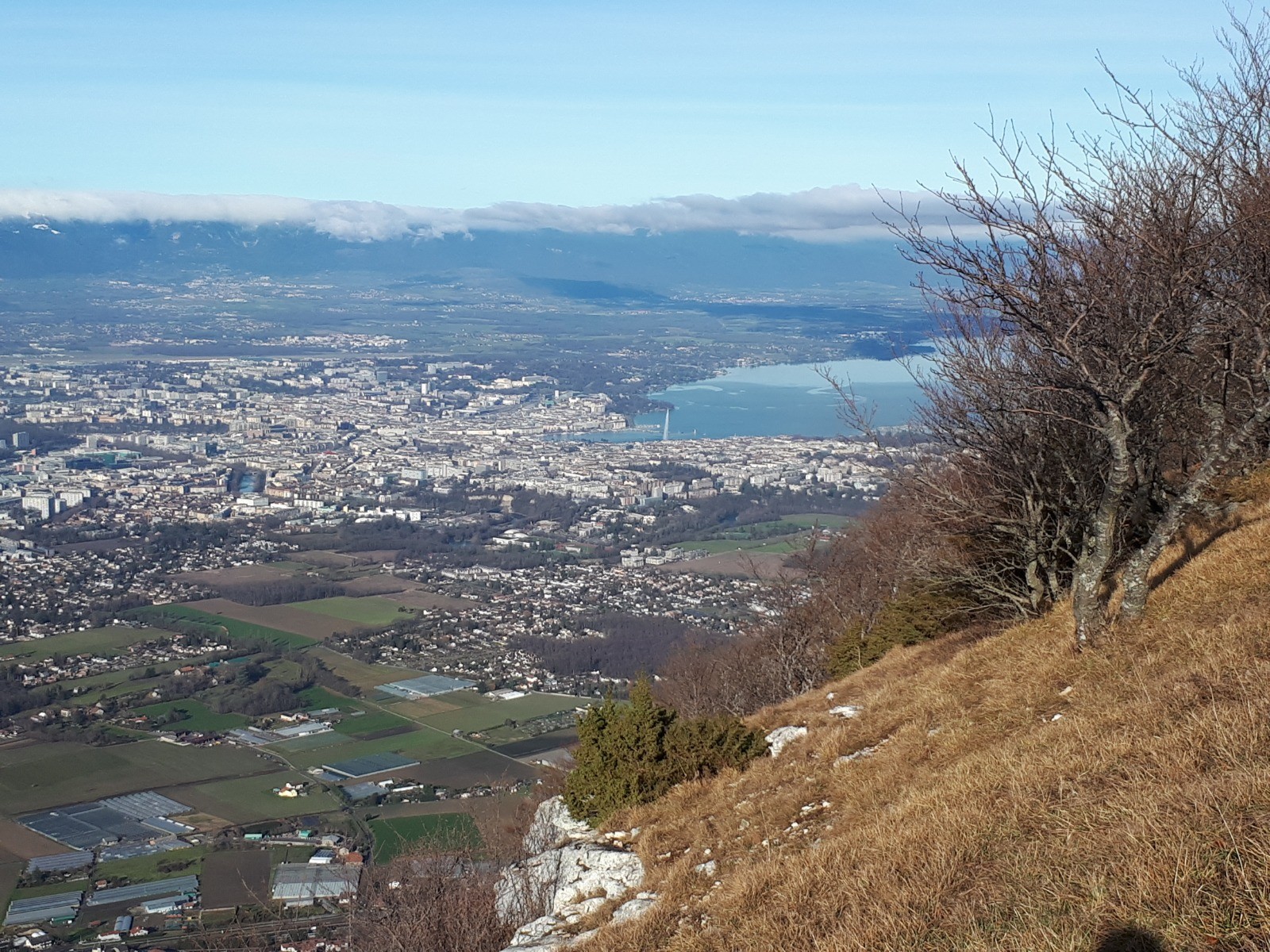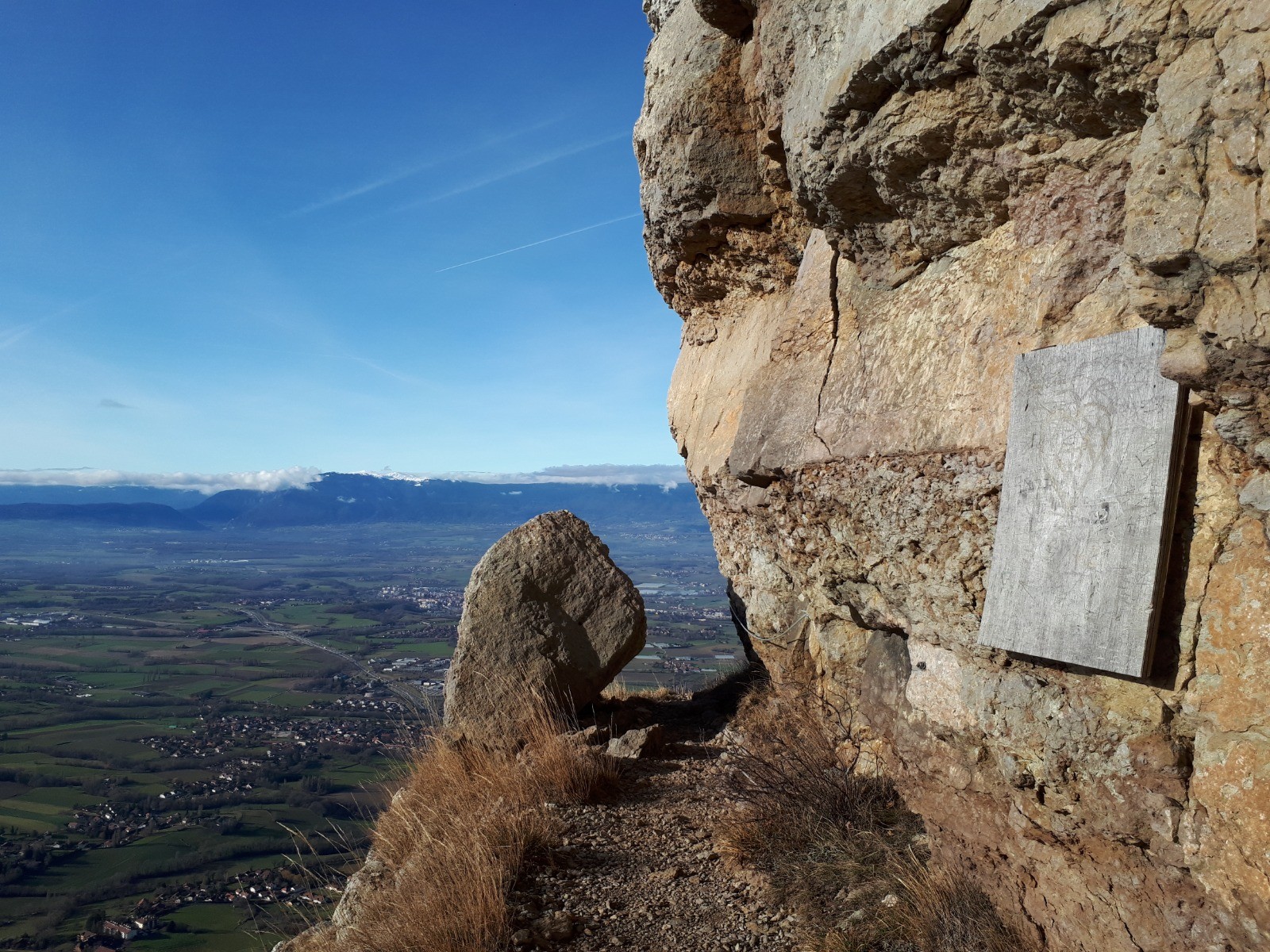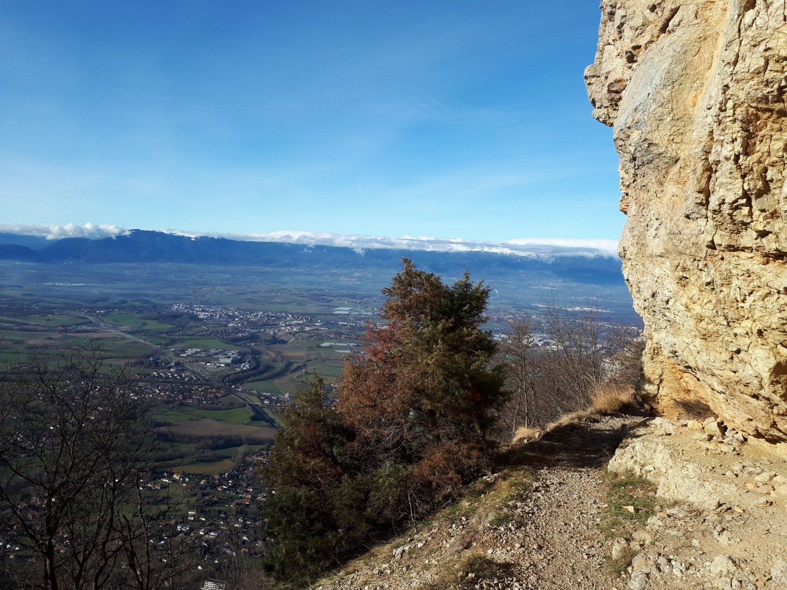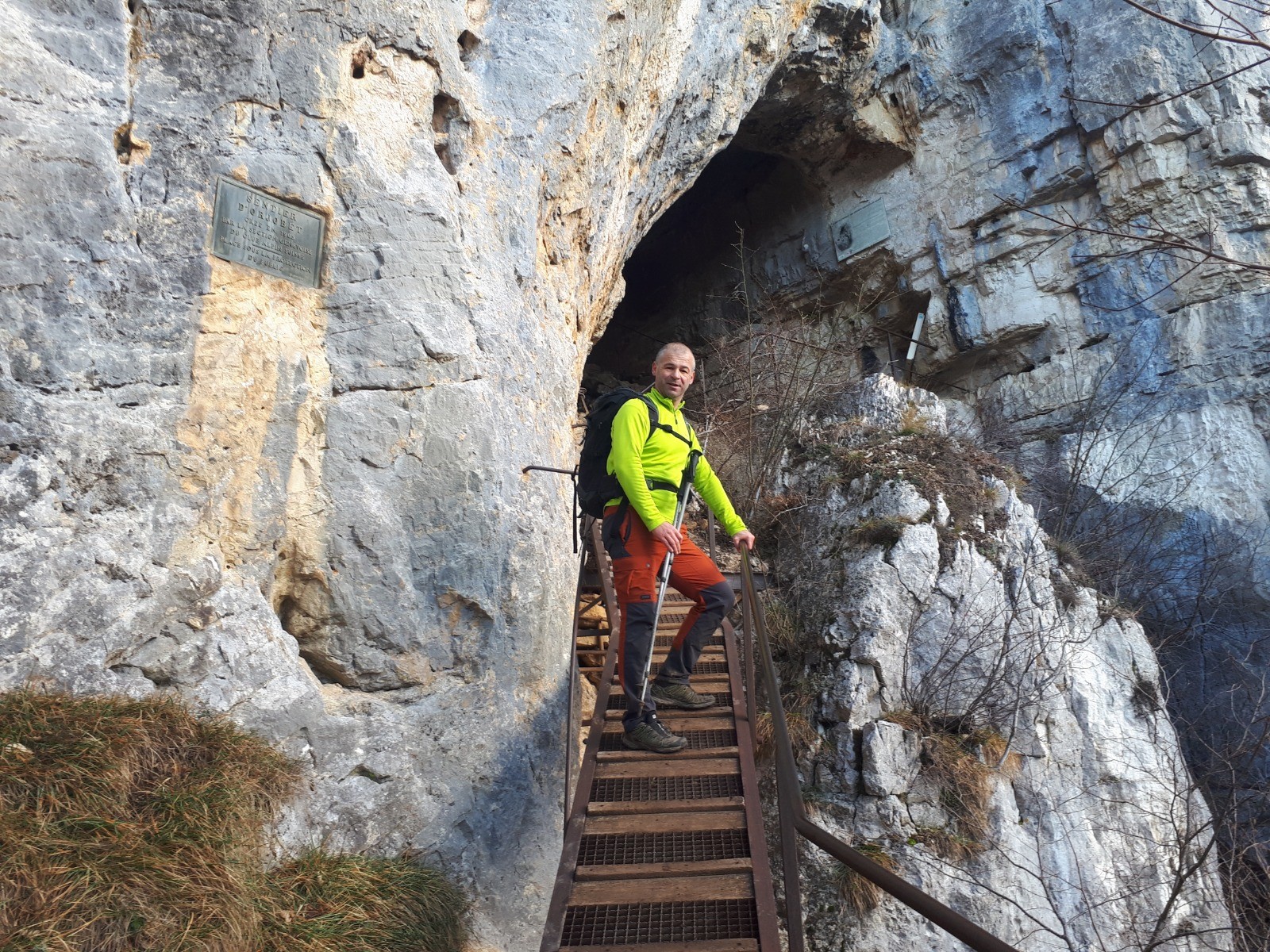 Montée : Par la Grotte d'Orjobet, très belle grotte que l'on traverse - le Trou de la Tine, arche de rocher spectaculaire et enfin le sentier de la Corraterie qui est splendide par une vire au milieu des falaises avec en prime un panorama sur les monts du Jura et Genève.