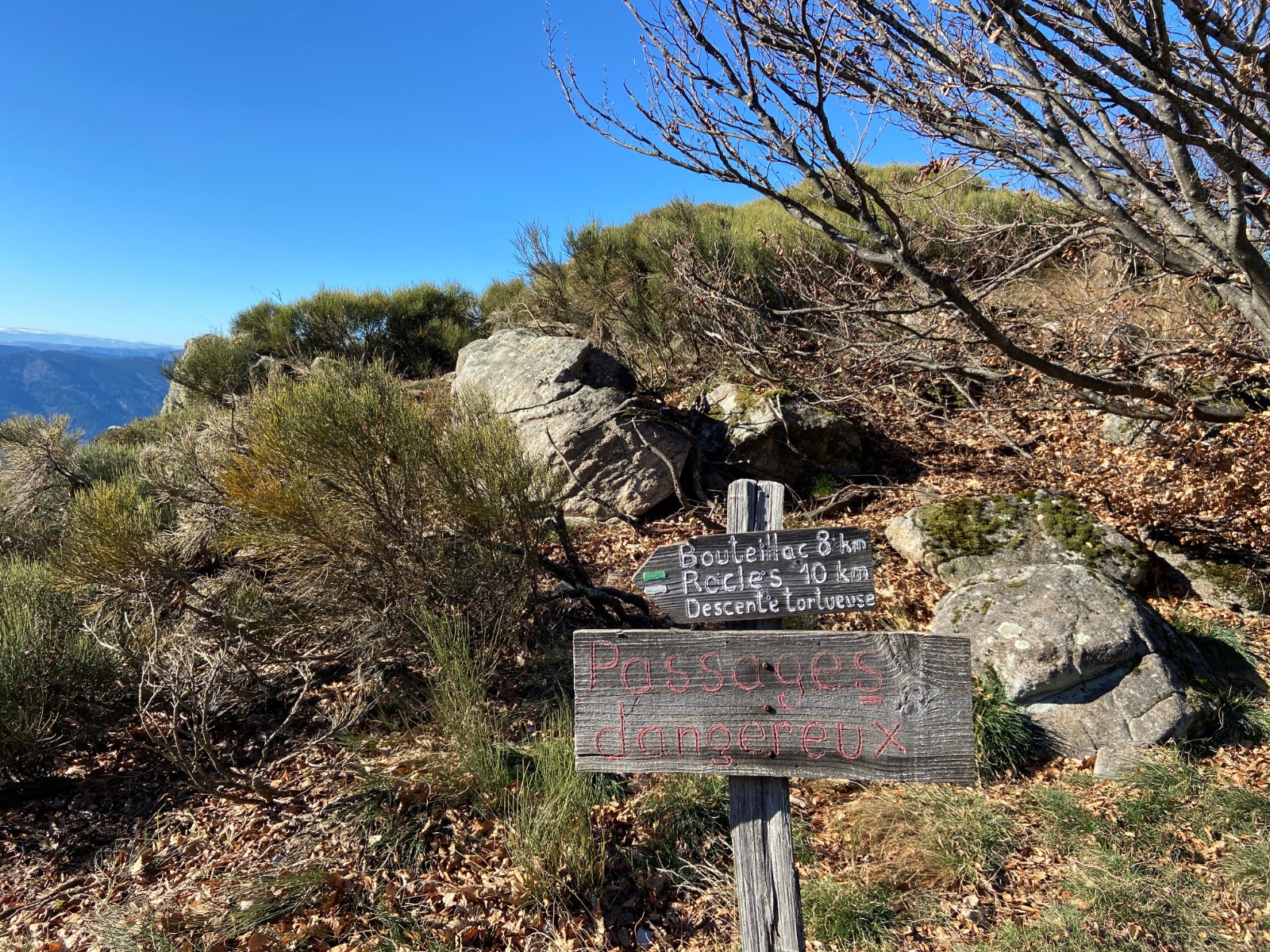 Départ du Col de la Croix de Rocles : petit parking à côté d'un local communal. Petit bout de route avant de descendre vers un ruisseau, puis remonter vers Bouteillac, très beau hameau restauré. Rencontre avec M. Nicollet, créateur du GRP du Tour du Tanargue. Montée raide après Bouteillac avec le balisage jaune et rouge du grp, jusqu'au fameux croisement qui va soit à Pissas soit au sentier dangereux de la Grange de Fabre. Le balisage change en jaune et blanc, recouvert de vert et blance par endroit.Au croisement, rester bien sur la droite pour prendre un chemin de traverse qui conduit à une piste, puis au départ de l'ascension dans la Grange de Fabre. Beaucoup de passages rocheux où les mains sont nécessaires, up and down réguliers. Arrivée à un trou qui peut être contourné (passage aérien). 1h45 pour l'ascension de la Grange de Fabre. Reste 150 m de dénivelé à faire avant la pause déjeuner et la vue sur la Cham du Cros. Redescente vers Pissas, puis le Vernet. Arrivée par le Jal.
