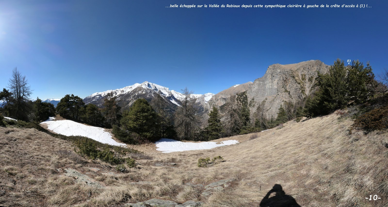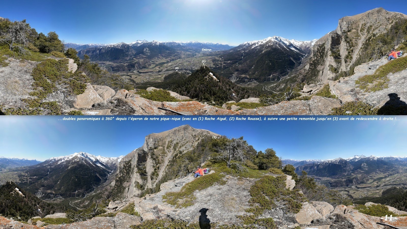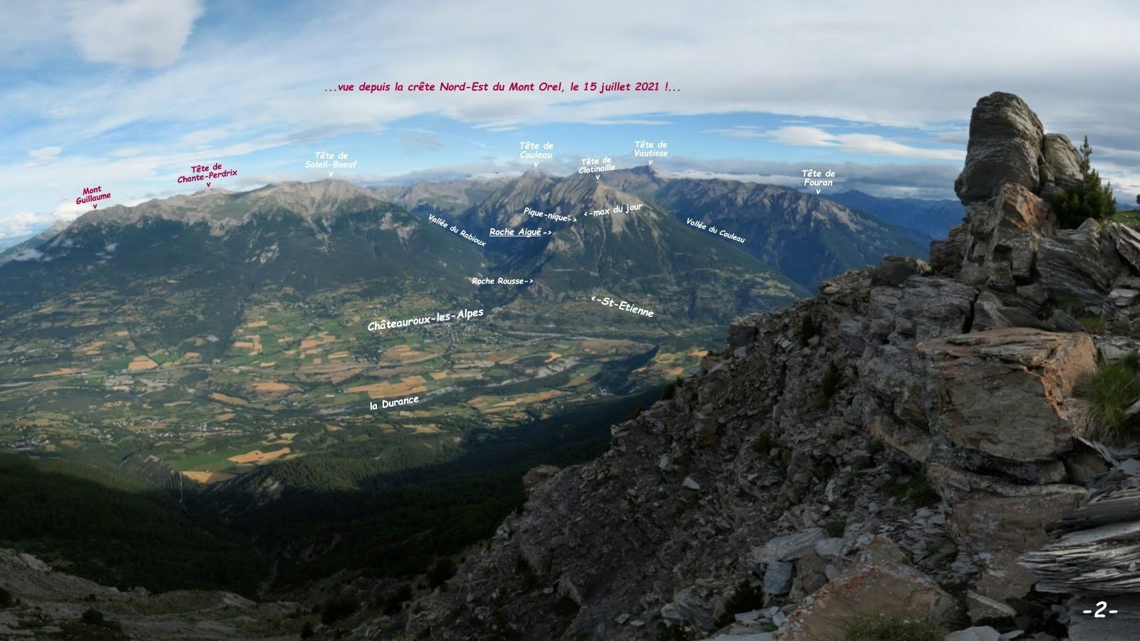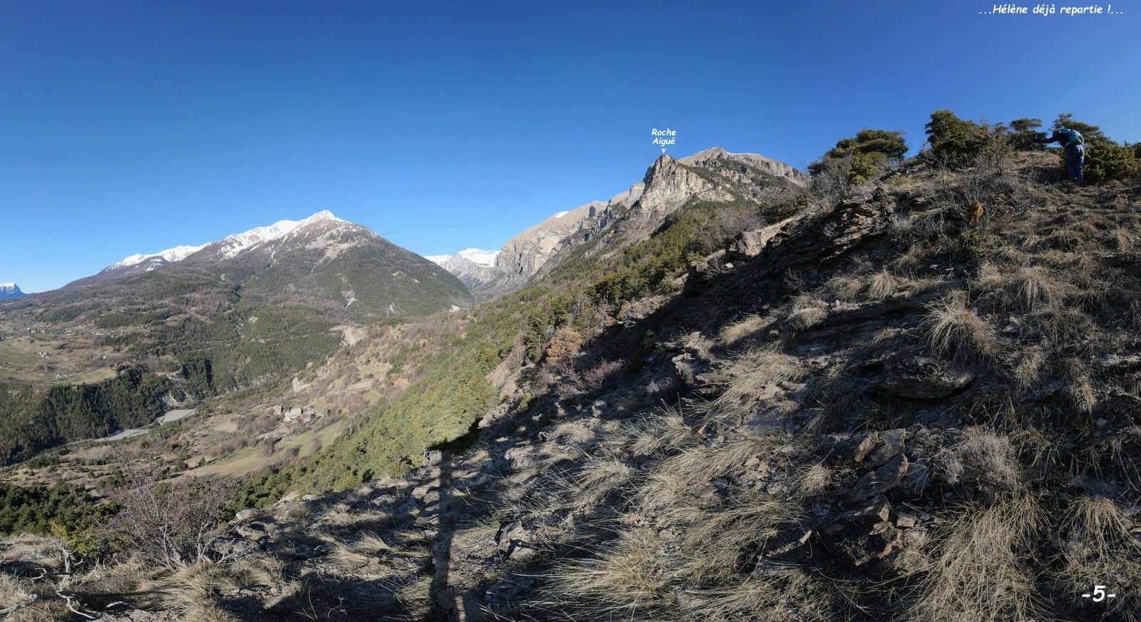 n'ayant pas trouvé de parking public à St-Etienne, nous nous sommes garés sur le parking du Gîte sans savoir si nous y étions autorisés et n'avons vu personne à qui demander !? > excellent sentier balisé du Belvédère de Roche Rousse d'où poursuivre au plus près de la crête s'étant avéré particulièrement dense et épineux, nous avons été contraints de rebrousser chemin, pour y accéder par une sente bien marquée qui traverse une petite clairière et remonte la crête jusqu'au Canal Rouvier > l'enjamber et poursuivre en crête par une sente toujours bien marquée jusqu'à un chaos de gros blocs où elle se perd > la suite est totalement sauvage et consiste en une traversée légèrement ascendante au pied des premiers contreforts de la falaise Sud de Roche Aiguë, en suivant tant bien que mal la sente à chamois la mieux marquée, jusqu'à un couloir pierreux bien marqué > le remonter jusqu'à venir buter sous la falaise dont il est issu > poursuivre par la vire ascendante à sa gauche en longeant le pied de la falaise sur environ 70 à 80 m de dénivelé pour ensuite s'en écarter franchement de manière à rejoindre la crête Nord de Roche Aiguë au plus près de son sommet qu'il suffit de rejoindre en la suivant pour un très impressionnant panorama sur les Vallées de la Durance et du Rabioux > revenir sur ses pas et poursuivre la crête jusqu'à venir buter sur la falaise de l'éperon suivant dont, en l'absence de tout renseignement, nous avons tenté et réussi le franchissement par une vire à chamois sur la gauche (ATTENTION : passage particulièrement pentu (entre 45 et 50° !) pas trop exposé grâce à la végétation mais quand même ! interdiction absolue de chuter ! > pour un deuxième fabuleux panorama nous avons pris le temps de revenir sur le haut de cet éperon pour un pique-nique haut en couleur, spectacle garanti > revenir sur ses pas et poursuivre en crête jusqu'à un surprenant mélézin qui permet sûrement de poursuivre encore agréablement cette crête sur environ 100 m de dénivelé (nous y avons renoncé pour ménager nos genoux vu la raideur de la pente à descendre avant de retrouver les draines de débardage empruntées par le sentier de la Pinée) > à cette fin, l'Ours ayant repéré que la pente serait moindre sous la cote 1910 m en rive gauche du ravin du Torrent de Champ Matheron, nous avons tenté de le rejoindre plus haut que la trace de son projet mais, manque de chance, la traversée de ce ravin n'étant difficilement pas possible avant, nous avons été contraints à une désagréable descente sur 120 m de dénivelé en rive droite > mais, la première draine trouvée, notre soulagement a été de courte durée vu le nombre impressionnant d'arbres déracinés en travers de celle-ci, transformant notre espéré final en roue-libre en un mini-raid Gauloise, jusqu'à retrouver la route de Serre Buzard à St-Etienne > retour parking.