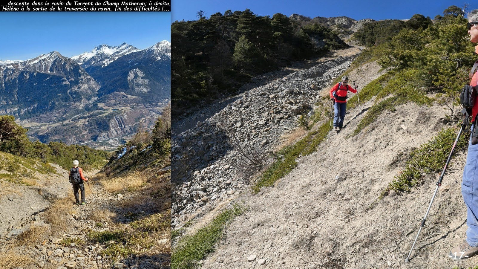 Chose faite sans grande difficulté, nous trouvons dommage qu'un sentier digne de ce nom n'y soit pas tracé car, de là-haut, le panorama est autrement plus spectaculaire que celui depuis le belvédère de Roche Rousse; certes la pente y est sévère, mais en évitant soigneusement les barres rocheuses et en restant toujours dans des zones boisées, l'exposition y est relativement faible, rien à voir avec le Sentier des Traverses au Pic de Morgon par exemple. Sur notre lancée, nous avons poursuivi cette exploration en contournant par la gauche l'escalier suivant pour un pique-nique royal à son sommet avant une descente légèrement plus cool, malgré la traversée quelque peu scabreuse du ravin du Torrent de Matheron. Les draines de débardage faisant office de sentier dans la Pinée rejointe, reste plus qu'à espérer une intervention armée de tronçonneuses pour les dégager des nombreux arbres déracinés qui les encombrent.