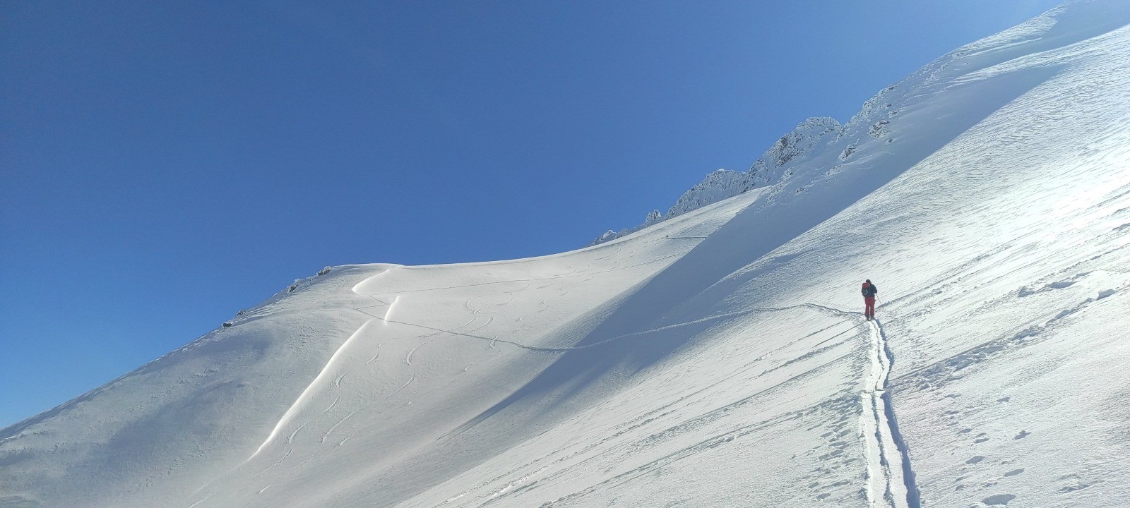 Et une magnifique en plus. Beau temps, pas de vent contrairement à ce qu'avait annoncé Joss et très, très bonne neige, aussi bien à la montée, sans couteau que pour la descente, une poudre du haut jusqu'en bas.